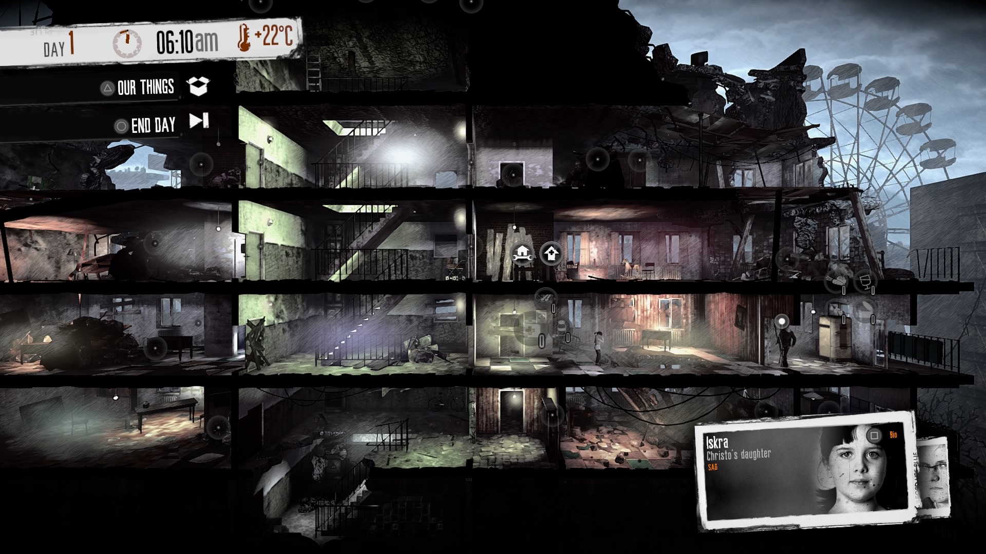 Ve dne máte na starosti veškeré potřeby a strádání postav. Musíte jim sehnat zásoby – jídlo, vodu, obvazy a další. Také je třeba, aby měli kde odpočívat a ukládat si své věci. Kromě toho také dům, nebo spíše to co z něj zbylo, se snažíte vylepšit. Barikádujete okna a dveře, atd. Ostatně v noci poznáte proč. Během noci musíte ven pro zásoby. Přes den jste totiž snadným cílem. Prohlížíte tak jiná stavení a sbíráte předměty. Mezitím však hrozí, že budete napadeni.
