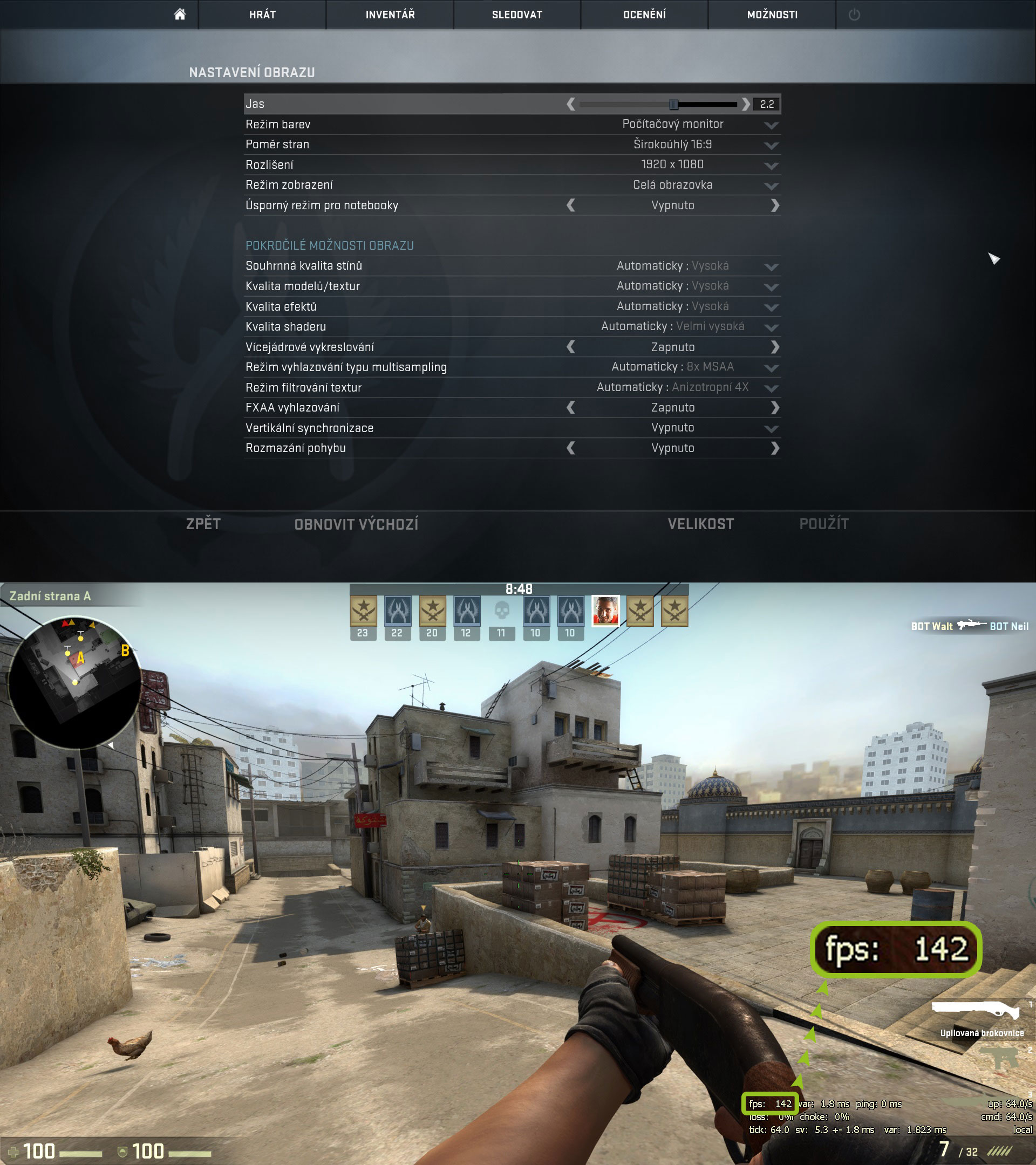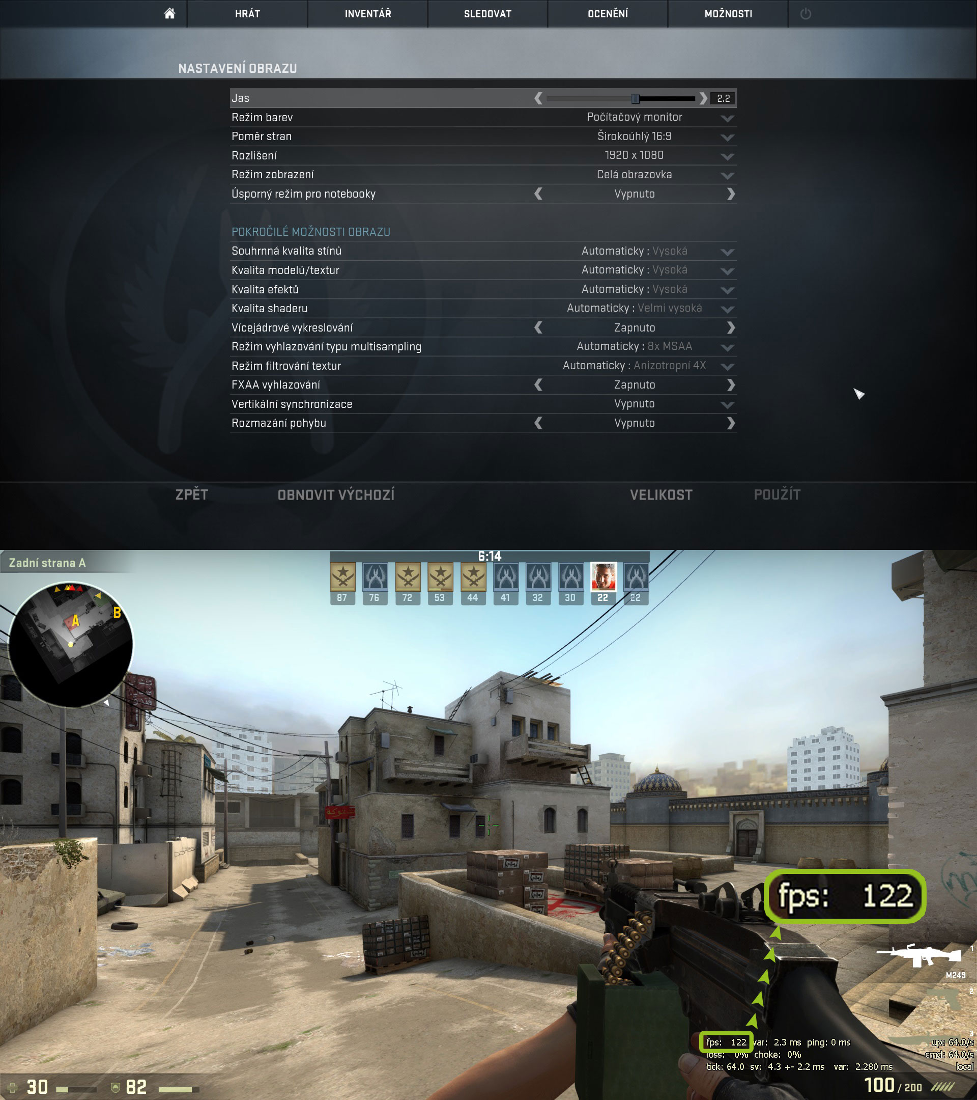 Aspire V17 Nitro nepostrádal výkon v žádných testovaných aplikacích ani hrách. Na příkladu vidíte, že si poradil s CSkem na počítačem navržené velmi vysoké detaily při zachování plynulosti na stabilních 125 FPS. Při odpojení napájení se zachoval podobně jako jeho 15 palcový kolega, se zapnutou funkcí pro dynamické ovládání snímkové frekvence šlapala hra plynule na 60 FPS při deaktivaci pak 115 FPS.