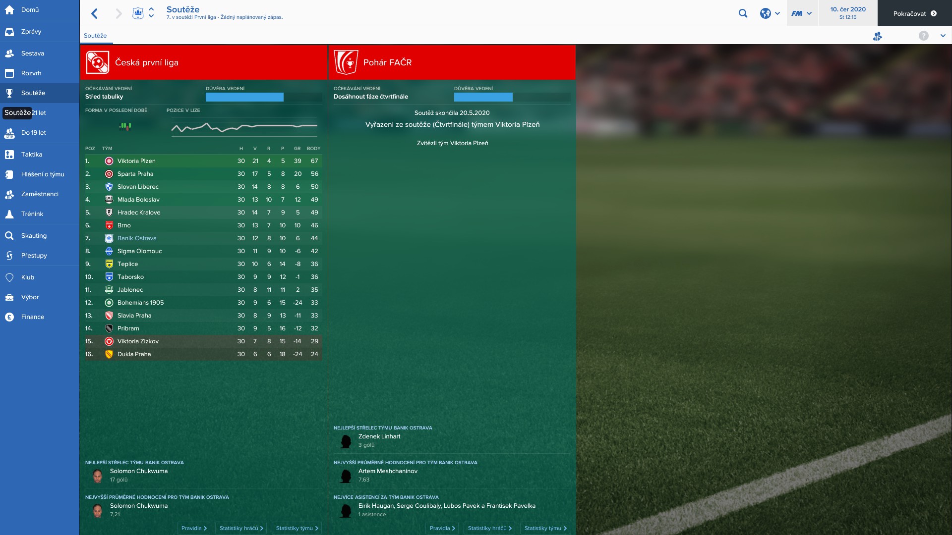Hezčí je i samotná prezentace všech tabulek a grafů, mnohem víc mě baví než kdy dříve koukat na faktory, které ovlivňují jednotlivá utkání. Podzimní část jsem mohl mít o dost lepší, nicméně klidný střed tabulky také není k zahození. Akorát se mi zranil kapitán Mičola, takže jsem jeho schopnosti používal jen v kabině místo na hřišti. Spojil jsem se s Olympiquem Marseille, abych mohl použít pár talentů zadarmo. Doufám, že se mi povede se dostat na pohárové příčky, pomoct by mi mohl i domácí pohár, kde jsem se dostal zatím do čtvrtfinále. Abych nemapoval jen moje snažení v české kotlině, zmíním se o Brexitu. Vývojáři ho do hry zapracovali, neboť bude mít měnit pravidla na britských ostrovech. Brexit nabízí několik variant, od nicotného zásahu až po pravidlo mít v základní sestavě jen zlomek cizinců. Hra výsledek náhodně generuje. Jako fanda Chelsea a anglické Premier League vůbec, mám velkou motivaci etablovat se na politické zásahy do tohoto sportu skrze odchod Británie z Evropské unie. Tohle se autorům opravdu povedlo.