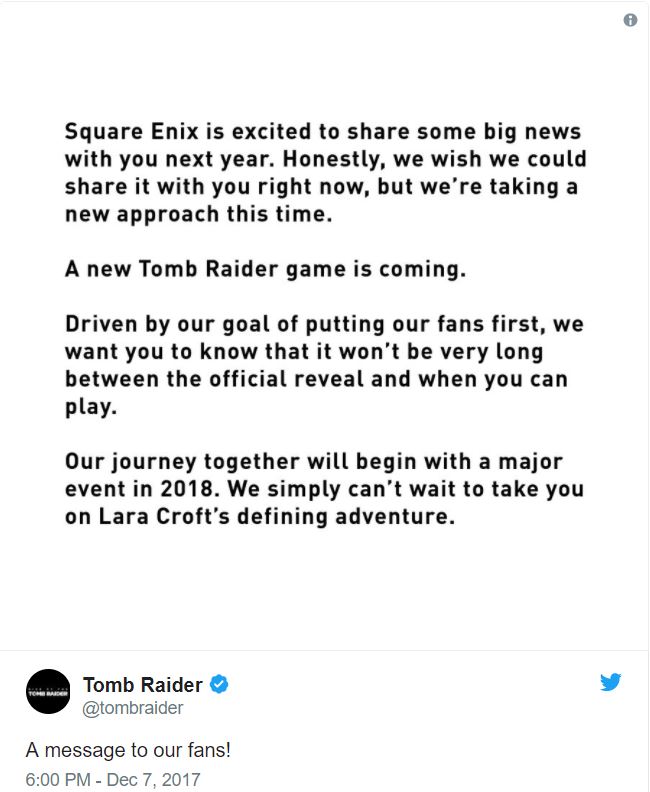 „Naše cesta bude začínat významnou událostí v roce 2018. Nemůžeme se dočkat, až Vás vezmeme na další dechberoucí dobrodružství Lary Croft.“ – (zbytek si můžete přečíst v celém Tweetu)