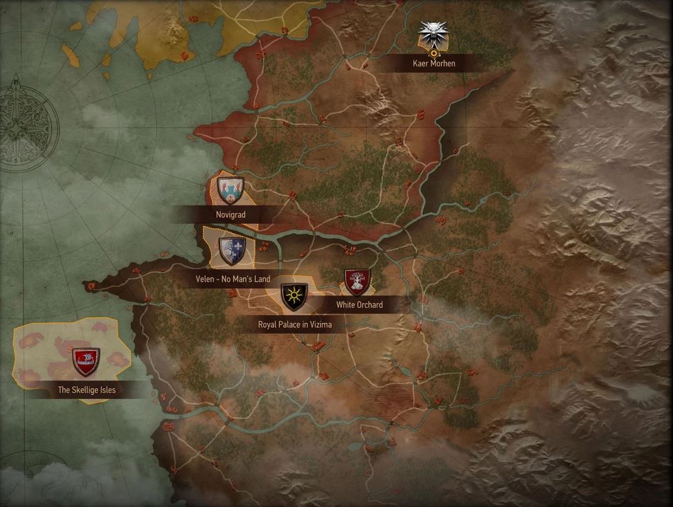 Nejmenší lokací je pak palác ve Wyzimě, toho času obývaný císařem Emhyrem. Z něj se pak Bílý vlk vydává do Velenu, bývalé provincie Temerie (nyní dobyto Nilfgaardem), země nikoho, oblasti poznamenané válkou a morem. Na stejné načtené mapě se pak nachází svobodné město Novigrad a univerzitní Oxenfurt.