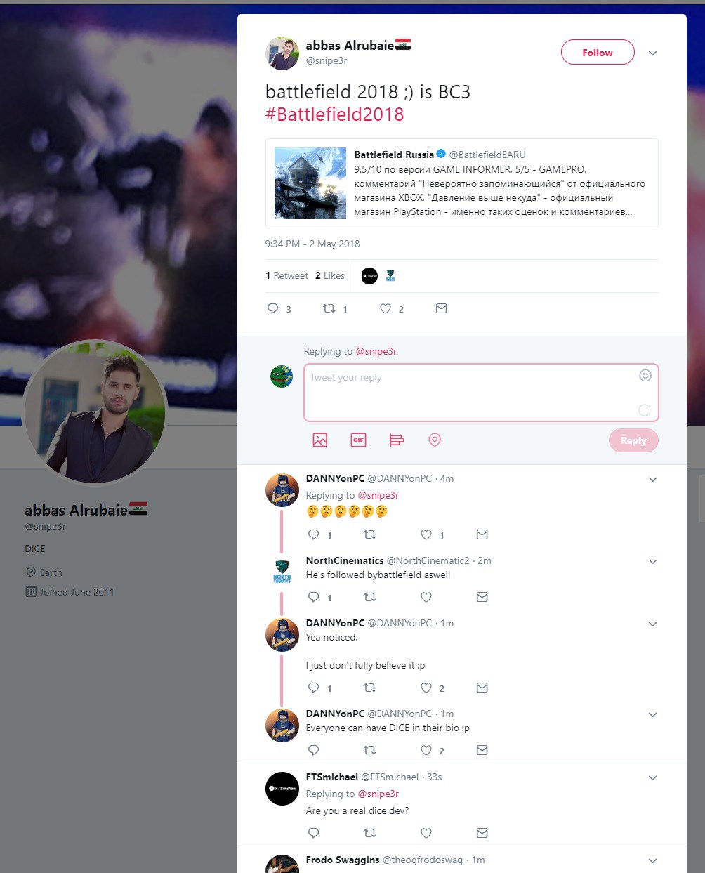 Na rôznych herných fórach sa nedávno objavili početné informácie týkajúce sa chystaného titulu z Battlefield univerza. Oficiálne sa síce nevie, o aký titul v podobe najnovšieho prírastku do rodiny Battlefield pôjde, no viaceré zdroje ukazujú práve na sériu Bad Company. Podkladom pre túto hypotézu by mohol byť aj nedávny tweet Abbasa Alrubaieho, zamestnanca DICE. Informácie na Twitteri následne zmazal, čo by mohlo poukazovať na ich legitímnosť. Screenshot z tweetu si môžete pozrieť na nasledujúcom obrázku.