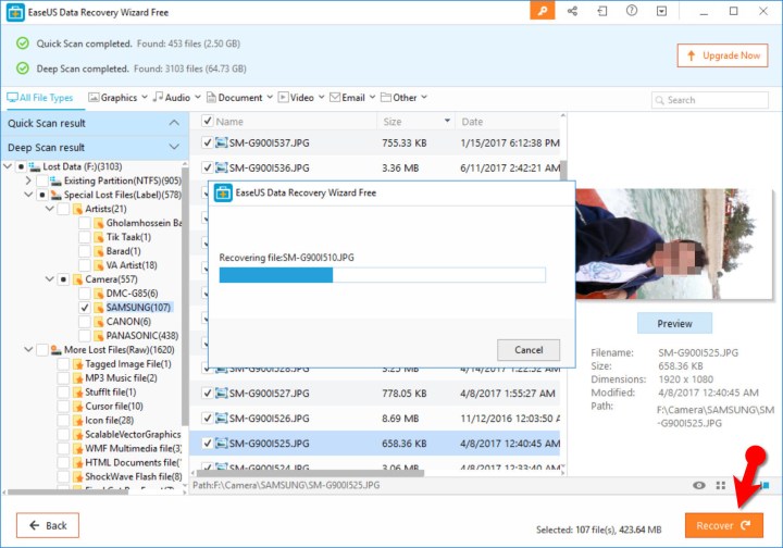 V menu, které se nachází na levé straně, si můžete zvolit, ze které složky chcete obnovit soubory. Poté si můžete zvolit samostatné soubory k obnovení. Poté stačí kliknout na oranžové tlačítko Recover, které se nachází v pravé části okna. Ještě jednou připomínám, že byste obnovené soubory měli ukládat do jiného adresáře (tzn. na jiný disk – například flashku), aby nedošlo k přepsání dat.
