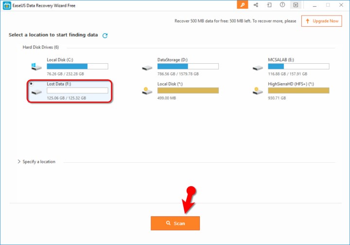 Po aktivaci programu už nám nezbývá nic jiného, než provést sken. Stačí si jednoduše vybrat, ze kterého disku chceme obnovit soubory a poté klikneme na oranžové tlačítko Scan.