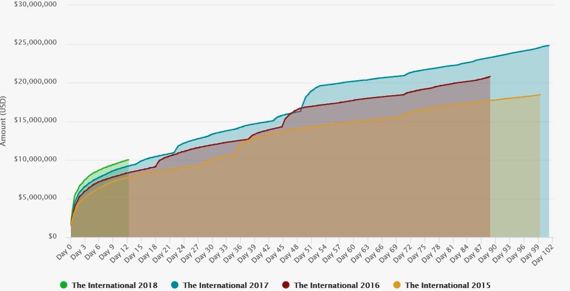 Hranica 10 miliónov $ bola pre tento ročník pokorená za neuveriteľných 12 dní. Vzhľadom na to je možné konštatovať, že stúpajúci trend bude v porovnaní s predošlými rokmi výrazne napredovať. Minulý ročník súťaže priniesol tento míľnik behom 15 dní a celková odmena sa vyšplhala k dychberúcej čiastke 24,8 milióna $. Víťazný tím Liquid si tak odniesol sumu takmer 11 miliónov $.