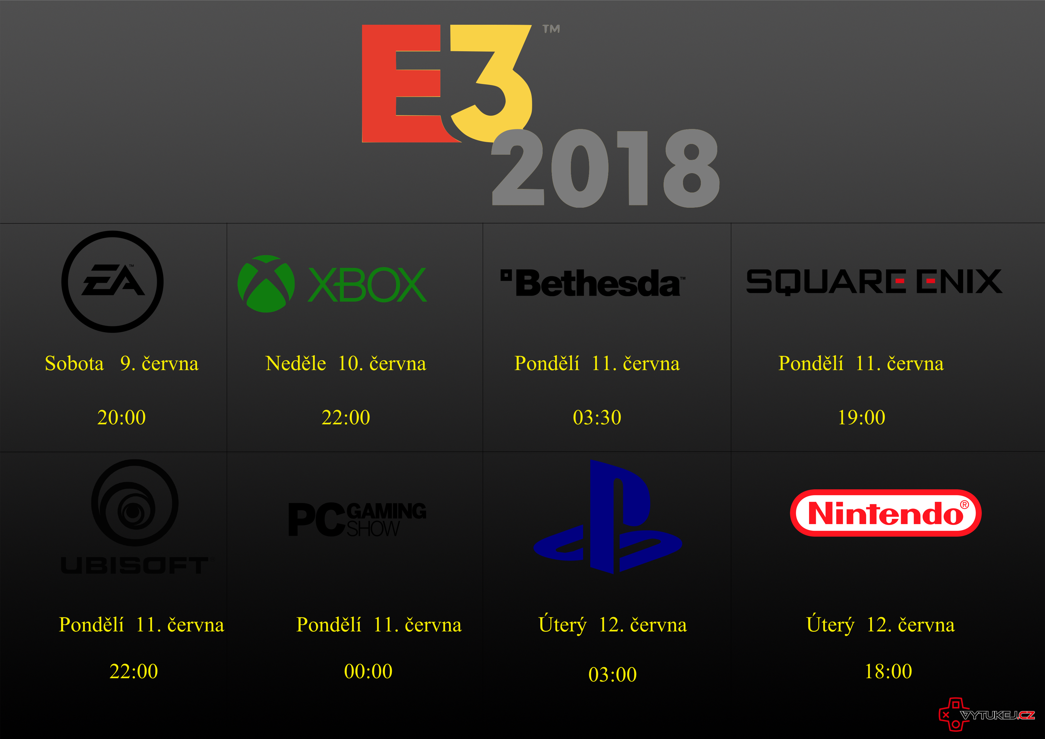 Napriek tomu, že sa E3 oficiálne začne až 12. júna (června), najväčšie herné novinky, predstavenia nových titulov a slávnostné odhalenia sa odohrajú už tento víkend. V nižšie uvedenom obrázku nájdete hlavných predstaviteľov, s uvedeným časom začiatku konferencie.
