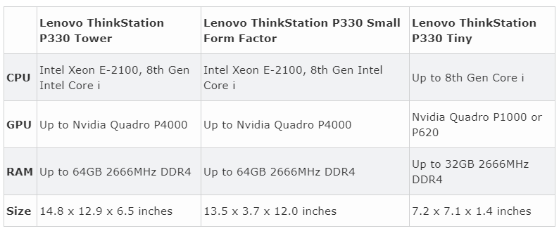 S příchodem nových Intel Xeon E procesorů společnost Lenovo oznamuje jejich novou sérii. Tu tvoří modely P330 workstation, P330 Small Factor a P330 Tower. Dle slov výrobce budou dostupné v srpnu roku 2018. Počítače jsou vybaveny procesorem Intel Xeon E. Větší stroje nabídnou až 64 GB operační paměti typu DDR4 a dva M.2 NVMe sloty pro úložiště. Mezi další výbavu patří USB Type-A, USB Type-C, DisplayPort, HDMI a Ethernet.