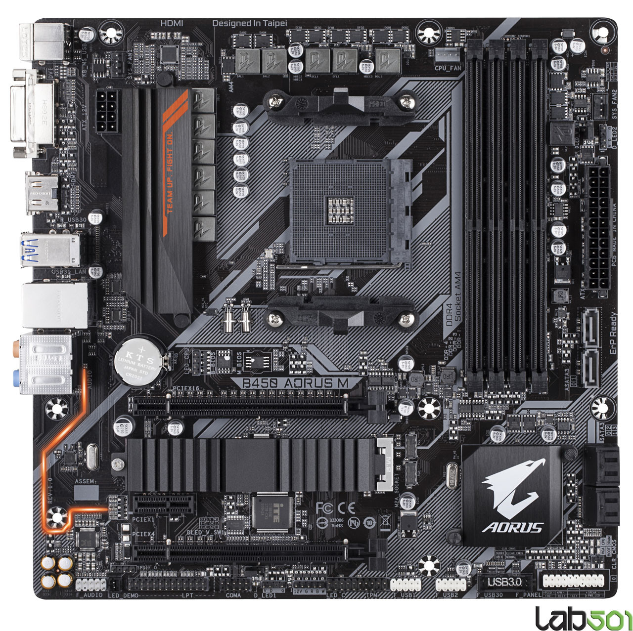 Aorus M B450 je vcelku podobný svému většímu bráškovi. Bohužel se ale u této desky nedočkáme heatsinků. Kvůli M-ATX velikosti také přijdeme o jeden M.2 slot. Zbyde nám tedy jeden M.2 22110 slot, které se automaticky přepíná s druhým PCIe 3.0 x16 slotem. Audio bude o něco horší, na druhou stranu se ale dočkáme starších PS/2 portů – zároveň ale přijdeme o jeden port USB 3.1 gen 2 typu C.