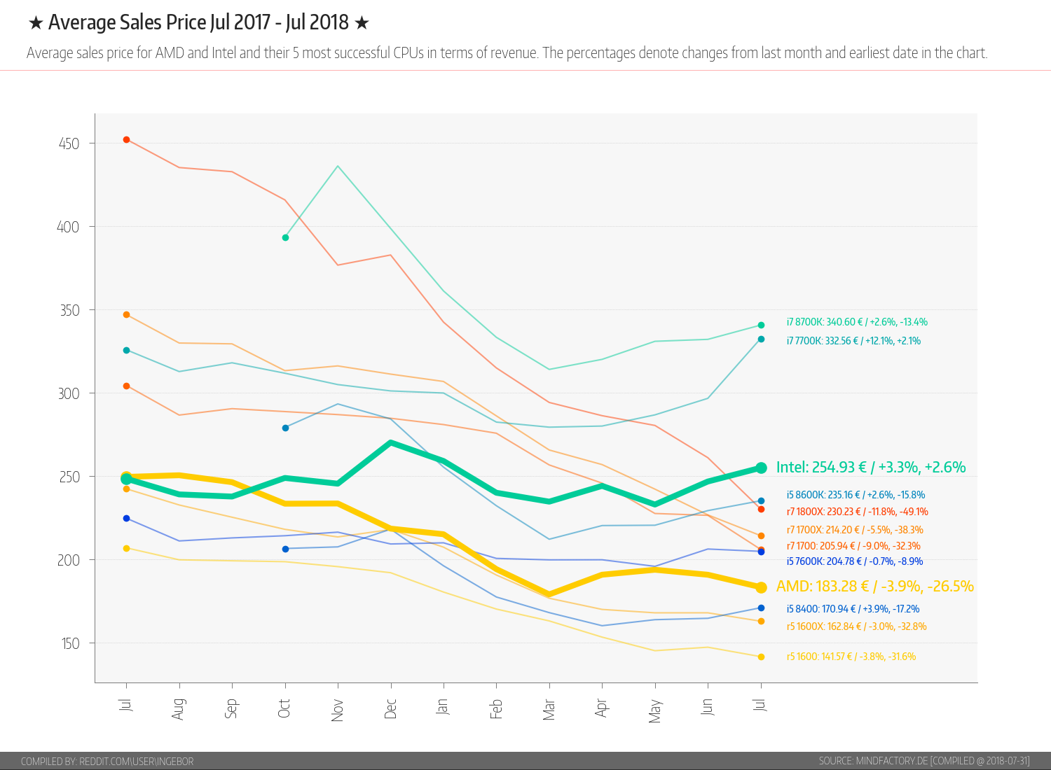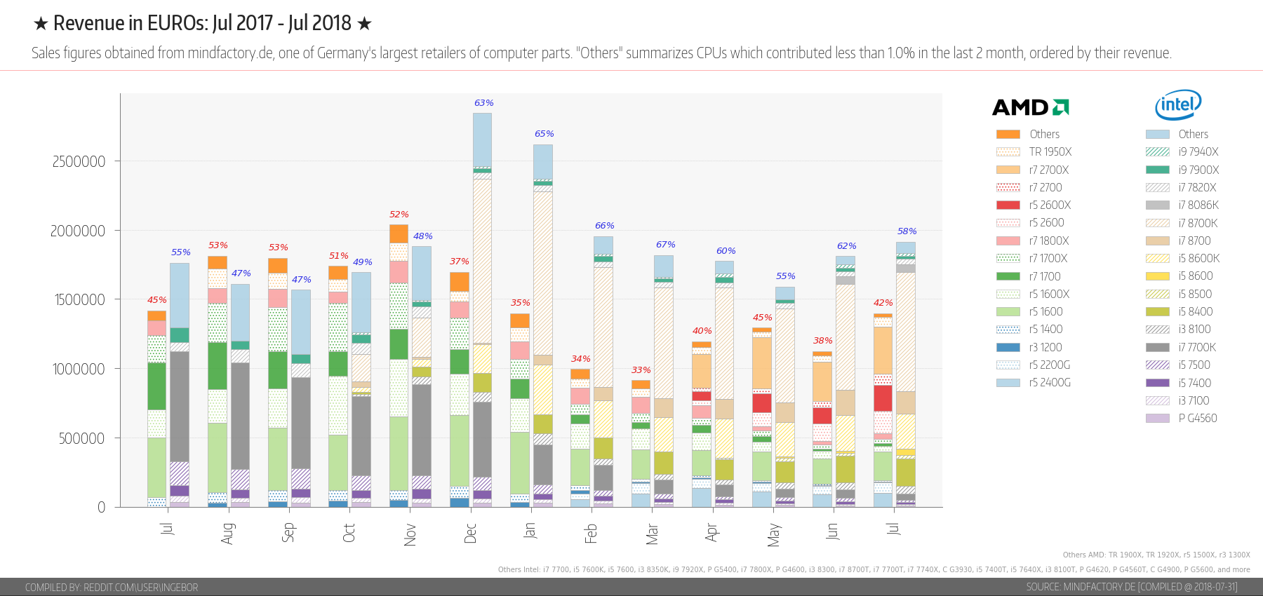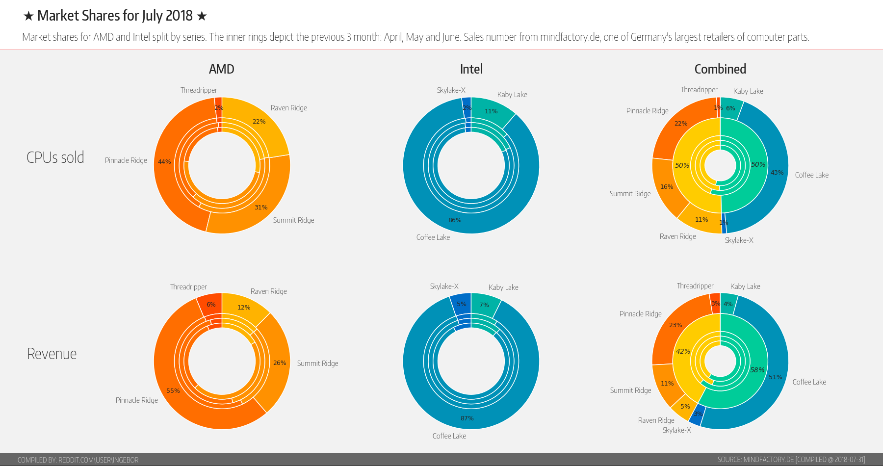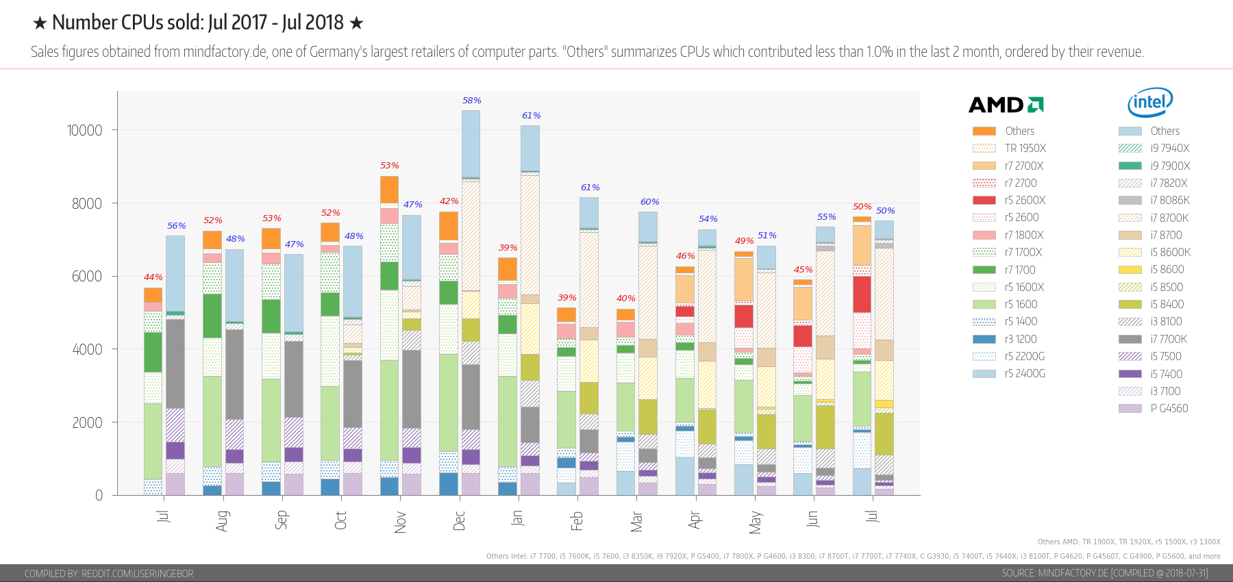 Poslední zprávy z německého Mindfactory tvrdí, že prodej procesorů AMD Ryzen a Intel Coffee Lake měly v červenci stejný podíl. Podíl AMD byl dokonce o několik málo procent větší, což by mohlo znamenat konec několikaměsíční dominance Intelu. Intel začíná pomaličku opravdu pokulhávat, alespoň tedy co se desktopových procesorů týče. Dle mého názoru (a vsadím se, že i názoru ostatních lidí) má AMD u desktopových procesorů prostě a jednoduše navrch.