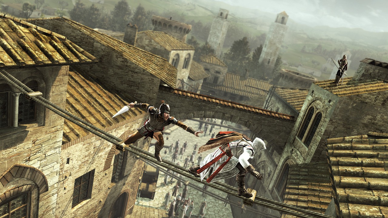 Pri otázke, prečo si tvorcovia titulu vybrali práve prostredie talianskeho Toskánska sa niet čomu diviť. Takmer celé územie pokrývajú nádherné zelené polia prepletené lesnými spoločenstvami, čo vytvára z rozosiahlych dediniek a menších miest dychberúcu scenériu. Inak to nie je ani v prípade mesta San Gimignano, s ktorým sme sa mohli stretnúť v druhom dieli Assassin’s Creed. Príbeh odohrávajúci sa v tomto meste hovorí o tajuplnom templárskom spiknutí, ktoré sa tu Ezio vydal odhaliť. Fanúšikovia si môžu spomenúť na vraždu postavy Vieri de’Pazzi, pri ktorej okrem hlavného aktéra Ezia vypomáhali aj Mariovi žoldnieri.