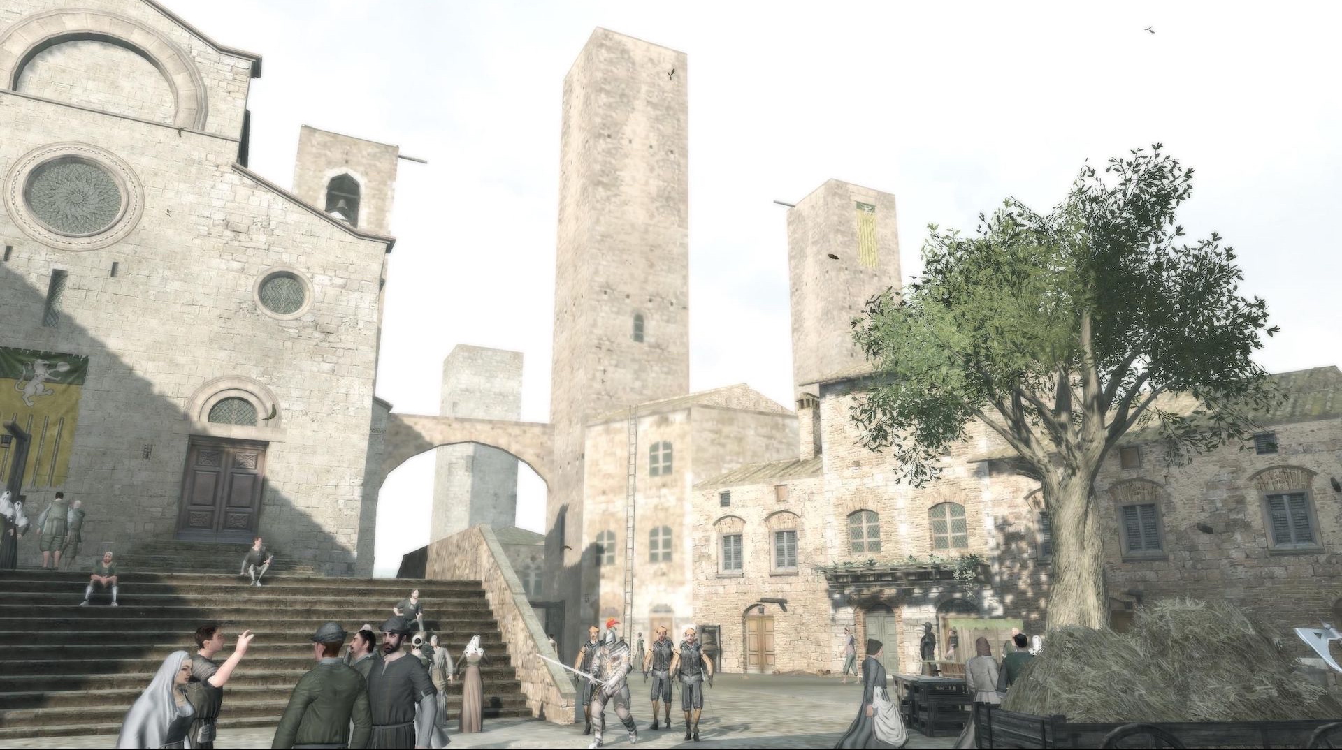Pravdepodobne najznámejšou budovou je Torre Grossa, ktorá zastáva úlohu dominanty mesta. S vežou sme sa mohli stretnúť v súvislosti s assassínskou hrobkou Wei Yu, no čo je zaujímavé, aj napriek tomu, že sa jedná o najvyššiu budovu v hre, viewpoint na nej nenájdete. Čo je však dôležitejšie, je samotná podoba reality a grafického spracovania v hre. Toto mesto je azda najvernejšou kópiou v porovnaní s ostatnými lokalitami, ktoré v hre môžeme nájsť. Uličky, strechy a aj samotné námestie je takmer totožné, s miernou odchýlkou v zmysle veľkostného pomeru. Ikonické budovy sa však nachádzajú na rovnakom mieste čo znamená, že v tomto prípade sa tvorcovia hry nenechali uniesť. Nerád by som predbiehal, nakoľko nás čaká ešte niekoľko miest (ktoré sú prakticky vzaté o niečo rozšírnejšie), no San Gimignano je v globále určite najlepšie spracovaným mestom, v ktorom autori len minimálne popustili uzdu svojej fantázii.