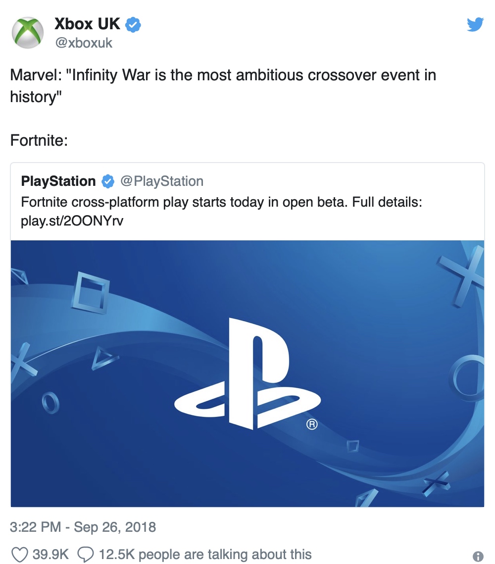 Oficiálny účet britskej divízie Xbox na Twitteri sa so svetom podelil vtipným príspevkom, ktorý odkazuje na nedávne rozhodnutie Sony. Microsoft je azda najväčším oporným stĺpom medziplatformového hrania, nakoľko o tejto skutočnosti hovorí už pekných pár rokov. Podľa predstaviteľov značky sa jedná o najväčší crossover v histórii gamingu. Postupom času by sme sa mali dočkať ďalších vyjadrení od známych tvorcov, ktorí podporia túto iniciatívu. Posledné informácie naznačujú, že novinkou Cross-Platform by mohol disponovať aj očakávaný Fallout 76.