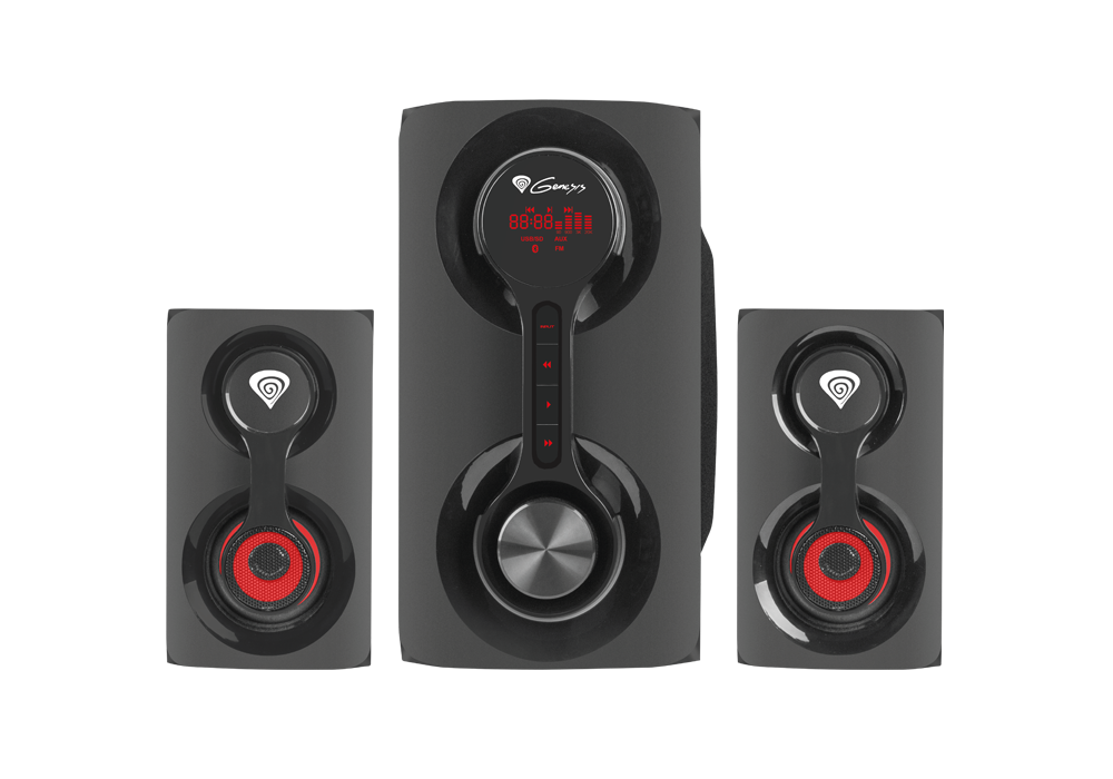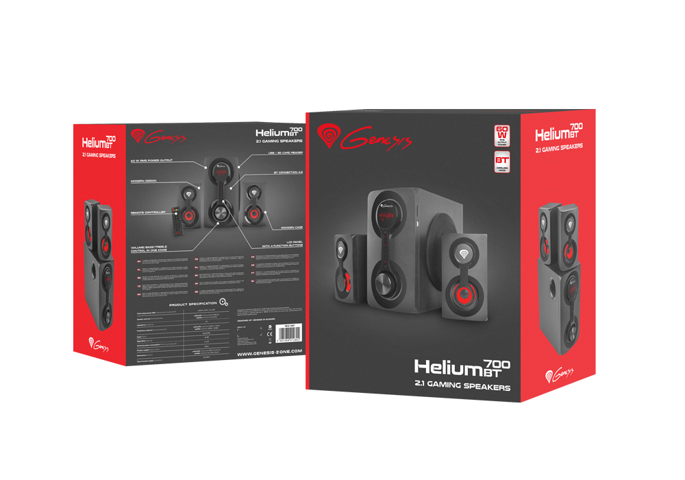 Poutavý soundtrack v pozadí a uchvacující zvukové efekty jsou nedílnou a důležitou součástí každé počítačové hry. Zvuk blížícího se nepřítele uprostřed silných explozí musí být slyšet za každých podmínek. Reproduktorová sestava 2.1 Genesis Helium 700BT s celkovým výkonem 60 W RMS poskytuje perfektní basy a prostorový zvuk, který vám přinese převahu ve virtuálním světě her a umožní ještě intenzivnější procítění děje. Reproduktory Genesis Helium 700BT toho ale umí mnohem víc. Jsou vybaveny množstvím dalších funkcí, jako jsou: drátové a bezdrátové připojení BT 4.2, dálkové ovládání, čtečka SD karet a připojení USB, LCD displej, dřevěné tělo reproduktorů a regulace basů i výšek.