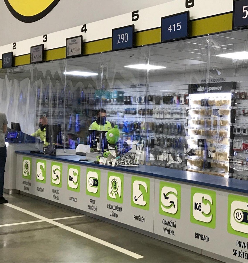 V rámci zvýšených bezpečnostních opatření a maximální ochrany zdraví všech osob v pobočkách Alzy vybavila firma okamžitě všechny zaměstnance přicházející do kontaktu s nakupujícími ochrannými nákrčníky s nanovlákennou membránou zn. Respilon, zavedla ochranné fólie (viz foto) a zároveň na všech provozovnách zavedla dezinfekční úklid, který nyní probíhá každou hodinu. Zvažuje se také dezinfekce vzduchu ozónem. K dispozici všem jsou rovněž antibakteriální gely, mýdla a jednorázové utěrky. V ostatních případech je k dispozici i rozsáhlá sít AlzaBoxů, služba AlzaExpres či další dopravní služby.