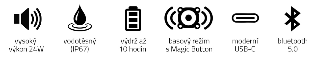 Reproduktor je osazený technologií MaxxBass pro čistý a velmi hutný zvuk. Milovníci výrazných basů ocení vychytávku v podobě tlačítka Magic Button pro silný basový soud.