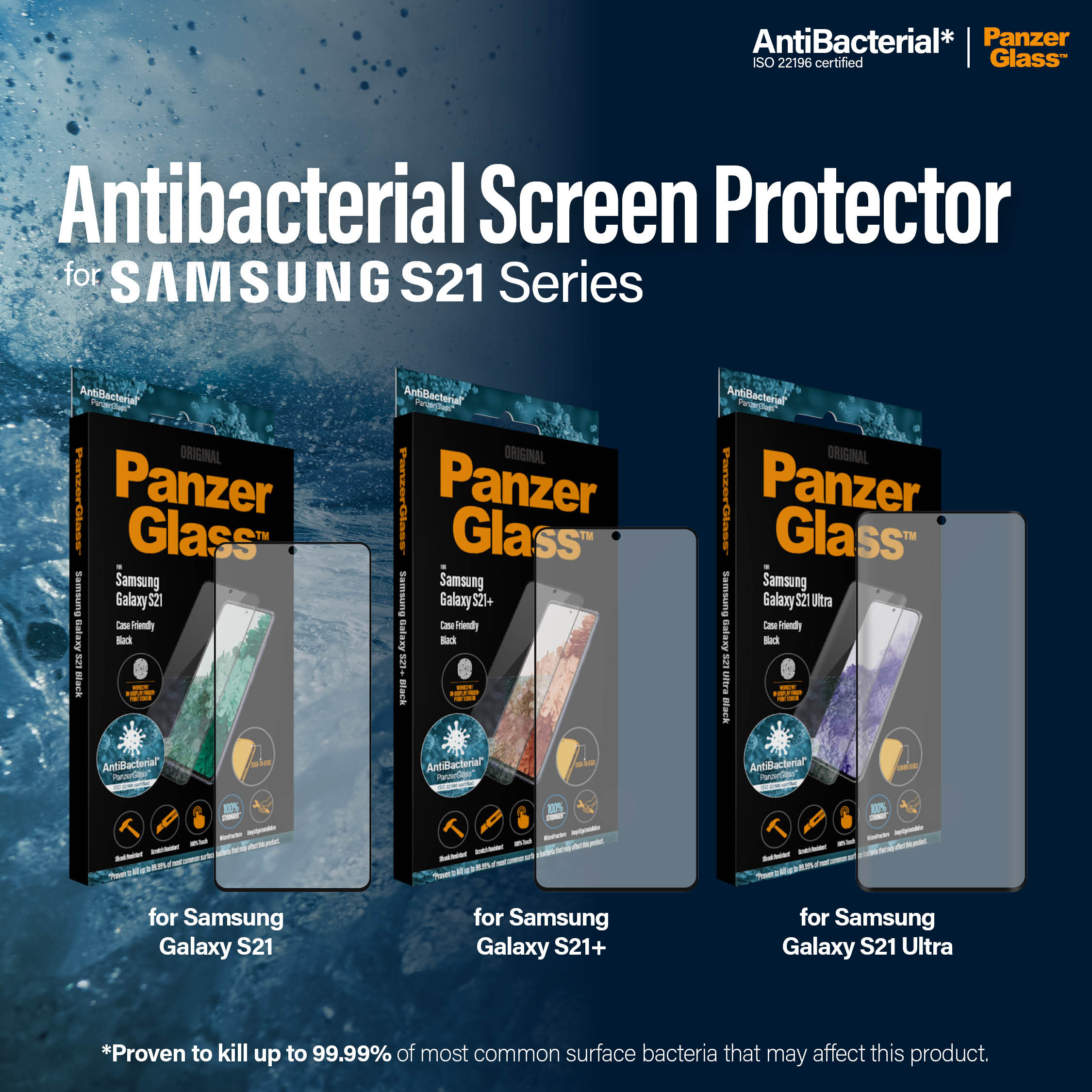 Všechna skla a obaly PanzerGlass pro nové modely Samsung Galaxy S21 jsou navíc ve verzi Anti-Bacterial, kdy je povrch potažen speciální vrstvou a antibakteriální úpravou, která zničí veškeré bakterie během 24 hodin od kontaktu. Kromě vylepšené odolnosti jsou tak skla bezpečnější a hygieničtější. Nové antibakteriální ochranné příslušenství PanzerGlass pro řadu Samsung Galaxy S21 je již v prodeji za cenu od 899 Kč v závislosti na vybraném modelu.