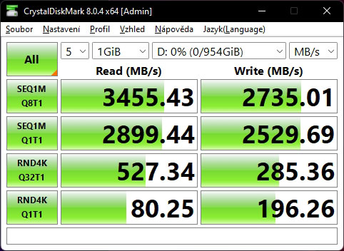 Test rychlosti v aplikaci CrystalDiskMark udávaná čísla potvrzuje – disk skutečně zvládl v sekvenčním režimu dosáhnout téměř na čistou hranici 3.500 MB/s a v zápisu dokonce vystřelil až nad 2.700 MB/s. Přesuny souborů i načítání aplikací tak budou opravdu bleskové.
