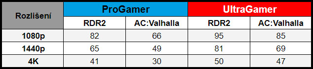 Univerzální herní stroj Grunex ProGamer 2022 nebo nadupadná mašina Grunex UltraGamer 2022 pro ty, kteří chtějí hry nasát v precizní atmosféře. To jsou možnosti pestrého výběru počítačů, které před vás LYNX staví a finální volba je jen na vás. Tak či tak se můžete pustit do sbírání zážitků ze současných masivních herních titulů i kompetitivních her. Rozlišení 1440p při plynulých snímkových frekvencích je takřka samozřejmostí a s nabušenější sestavou se můžete směle opřít i do hraní ve 4K. Srovnání námi testovaného výkonu ve hrách Red Dead Redemption 2 a Assassin’s Creed Valhalla najdete v následující tabulce.
