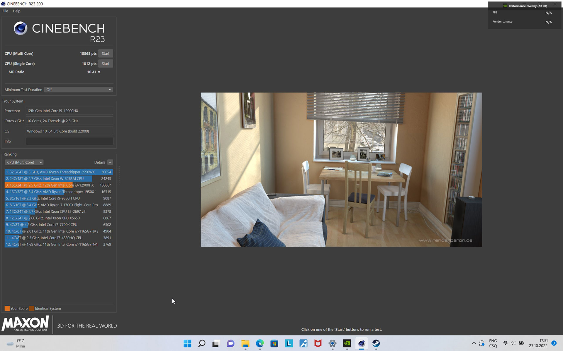 Ještě před herními testy ovšem zmíníme zbylé specifikace. Procesor Intel Core i9-12900HX s 24 vlákny totiž rovněž patří k velmi výkonnému kusu křemíku. Ukázal to ostatně i Cinebench R23. Skóre 18 868 bodů nechává za sebou i některé desktopové čipy.