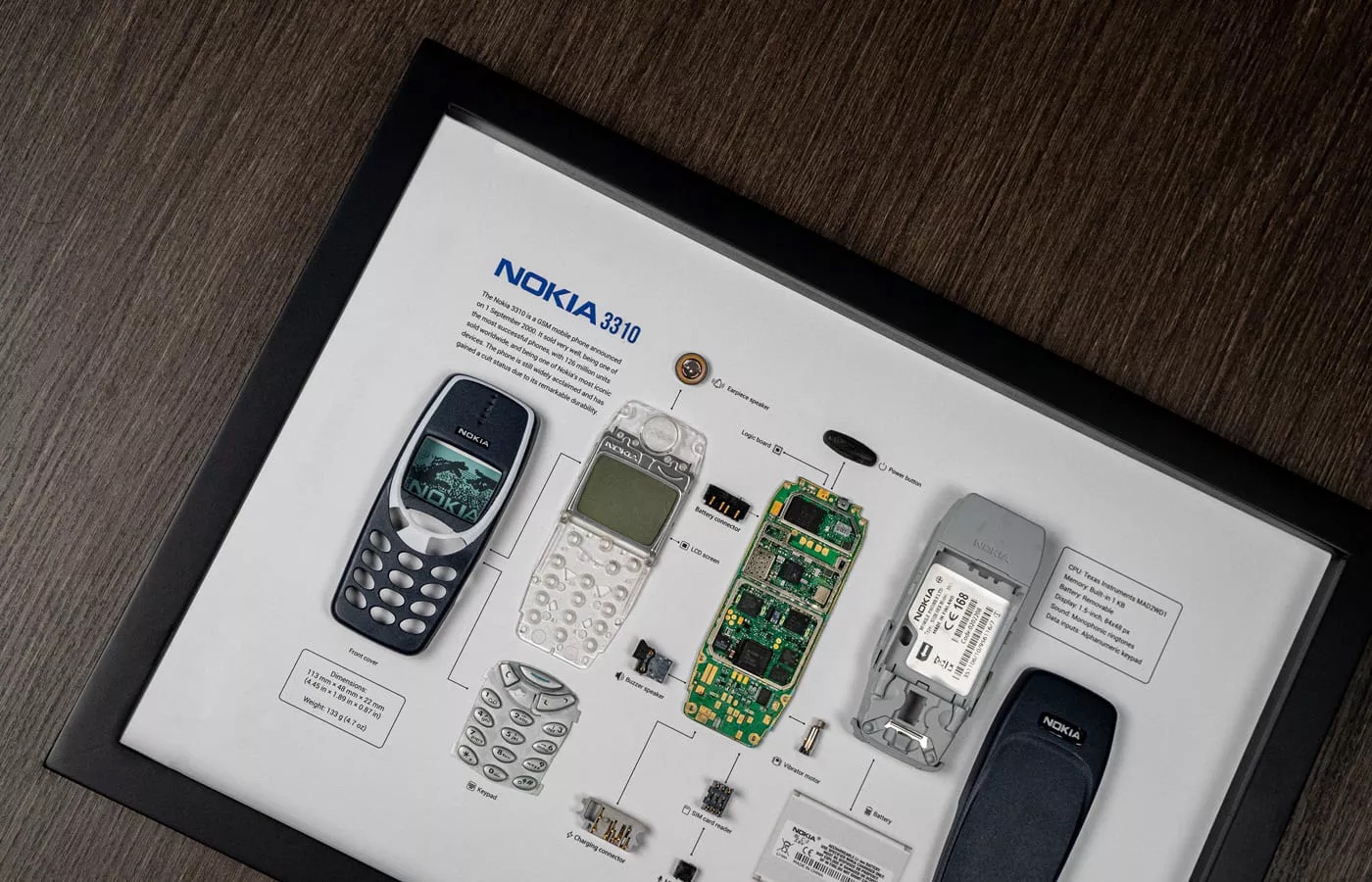 Relativně nedávno představeným obrazem z dílny GRID je i výše zmíněná Nokia 3310, kterou lze bez jakékoliv nadsázky označit za jeden z nejlegendárnějších mobilních telefonů všech dob. Ve světě se proslavil zejména pro svou extrémní odolnost v kombinaci s velmi dobrou výdrží baterie či ikonickým designem. Jen pro zajímavost, Nokii se podařilo prodat na 126 milionů kusů tohoto modelu, což z něj dělá suverénně nejprodávanější telefon z dílny tohoto výrobce všech dob. A díky GRIDu se lze nyní podívat do jeho útrob a udělat si tak obrázek o tom, co přesně stojí za jeho úspěchem, respektive co jej pohání uvnitř. Tento exkurz je zajímavý i z toho důvodu, že se jedná o telefon představený 1. září 2000 – tedy před více než 22 lety. Pohled na útroby tohoto modelu je tedy do jisté míry jakýmsi návratem v čase a pokud jej pověsíte například vedle obrazu některého z iPhonů, dočkáte se skoro až neuvěřitelného kontrastu. Vždyť třeba model 3310 dělí od iPhonu 2G, který má GRID taktéž v nabídce, pouhých 7 let vývoje, které však stačily na to, aby se z cihličky stalo něco, co v upravené verzi používáme doteď. Pokud vás tedy Nokia 3310 ve formě obrazu láká, či byste si rádi svou kancelář, pokoj či byt ozdobili nějakým tím obrazem z dílny GRID, směle do toho. Stojí to totiž rozhodně za to!