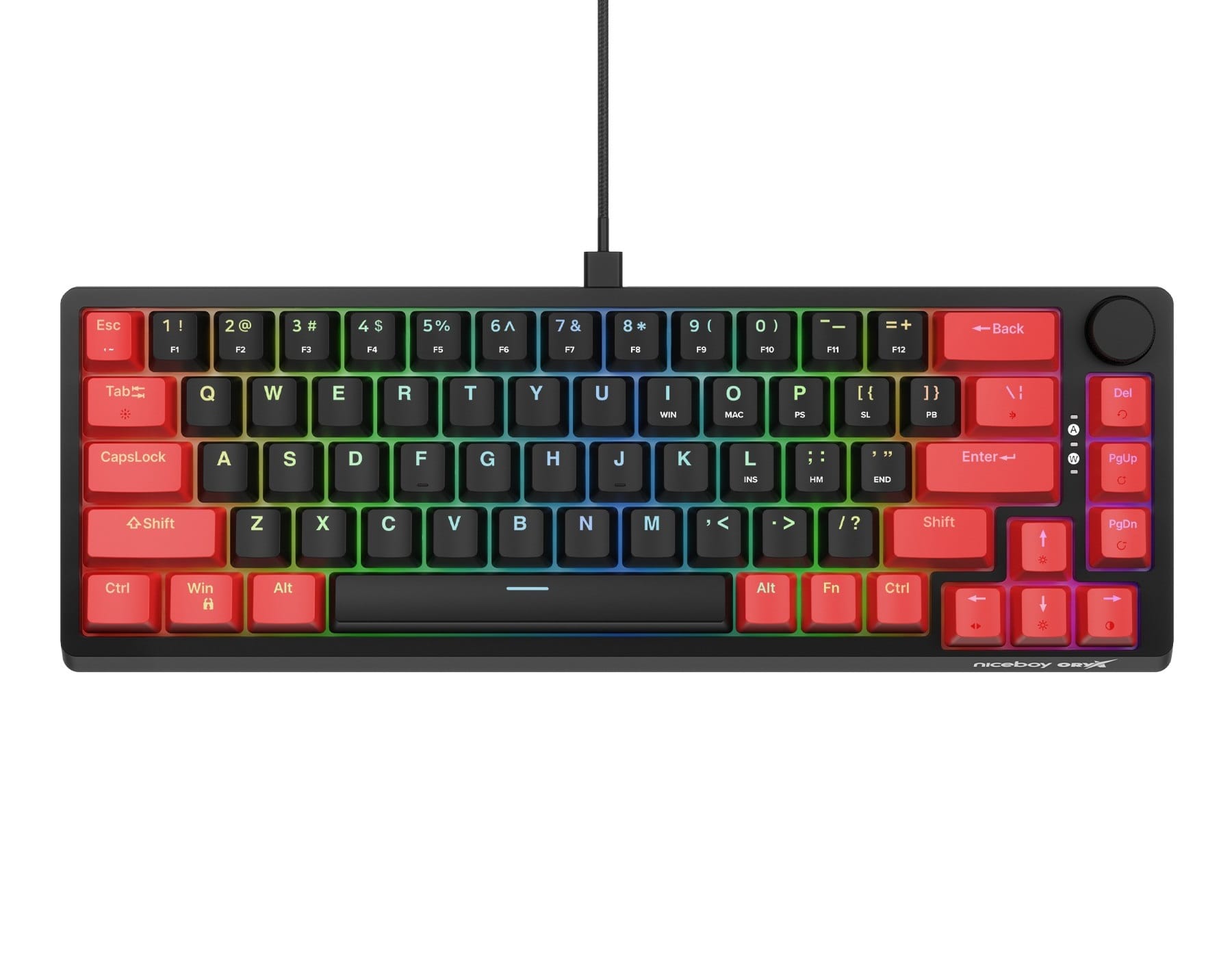 Niceboy ORYX K700X PRO je navržena v populárním kompaktním designu bez numerického bloku, který se mezi hráči těší stále větší popularitě, protože ponechává větší prostor pro efektivnější pohyb myši. Na těle klávesnice najdete 68 nejpoužívanějších kláves s vysokým zdvihem včetně šipek a užitečné kolečko pro rychlé ovládání hlasitosti. Klávesnice má tuhý, robustní rám, který prodlužuje životnost a navíc podporuje dobrou stabilitu klávesnice na stole.