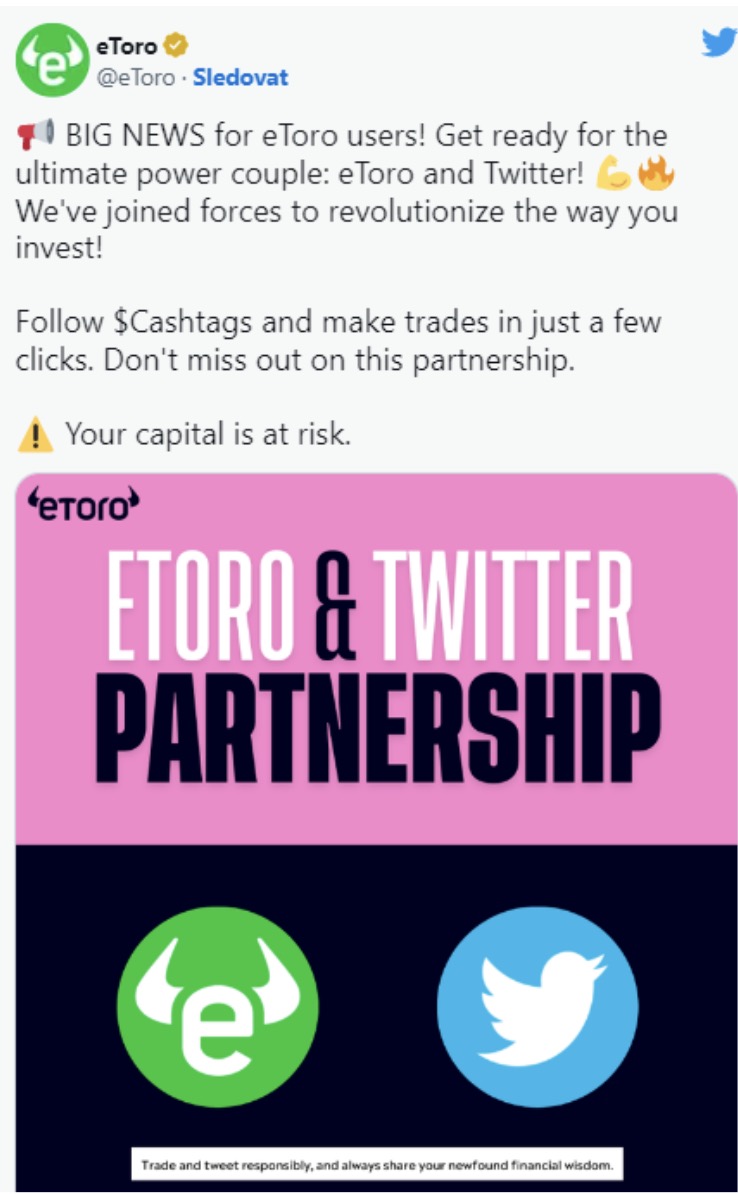 eToro se rozhodlo spolupráci s Twitterem uzavřít především proto, že vnímá rostoucí trend, podle nějž se velká část uživatelů Twitteru zajímá o investování a finanční trhy. Podle předpokladů by se tak společnosti mělo podařit přilákat více nových uživatelů, a to i těch, kteří by na její platformu za normálních okolností nezavítali.