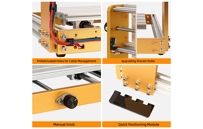 Rám těla frézy je vyroben z mimořádně silné hliníkové slitiny. Její ramena jsou poháněny vodicími šrouby, které zajišťují mimořádnou přesnost v kombinaci s dlouhou životností. Lineární vedení je vyrobeno z dokonale přesně opracované oceli o průměru 12 mm, která zajišťuje plynulý a přesný pohyb zajišťující mimořádné výsledky při frézování. Srdcem frézy je výkonný 500W 52mm motor s kleštinou E11, který dokáže gravírovat a řezat mnoho materiálů včetně hliníku. Celokovová osa Z má neuvěřitelných 60 mm vertikálního zdvihu, což vám umožňuje používat bity 1/4″, díky čemuž si tak snadno poradíte i s projekty náročnými na rozměry. Základní deska našeho CNC stroje je GRBL F1.1, která je kompatibilní s i příslušným z dílny konkurence, stejně tako jako s cizím softwarem. Software vytvořený přímo pro tuto gravírovačku a montážní návod jsou pak samozřejmě součástí dodávky, takže se není absolutně třeba obávat toho, že byste nepochopili, jak zařízení funguje.