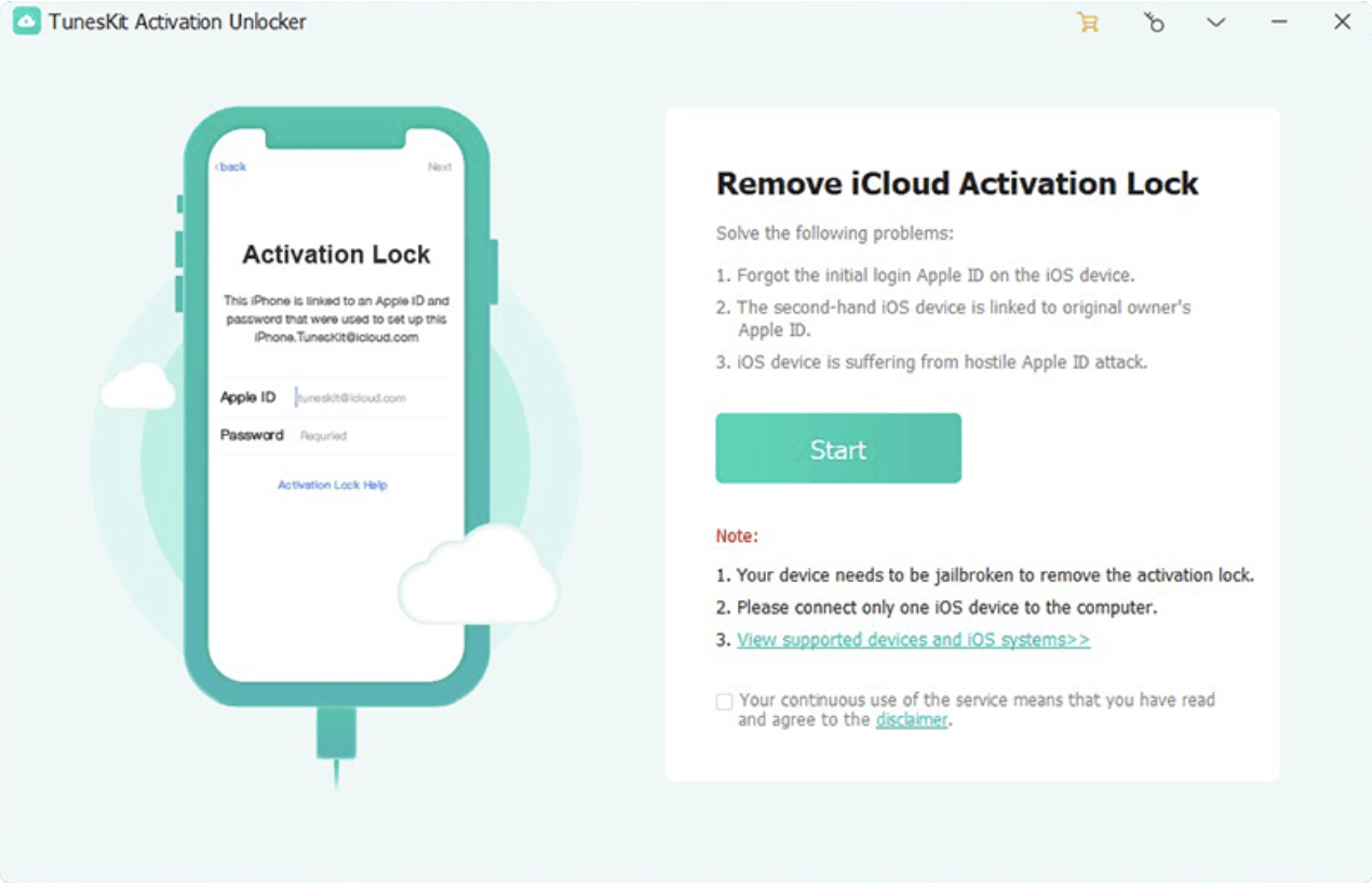 Stáhněte si a nainstalujte TunesKit Activation Unlocker do svého notebooku/počítače. Poté jej spusťte a připojte zařízení k počítači pomocí kabelu USB. Klepněte na tlačítko „Start“.