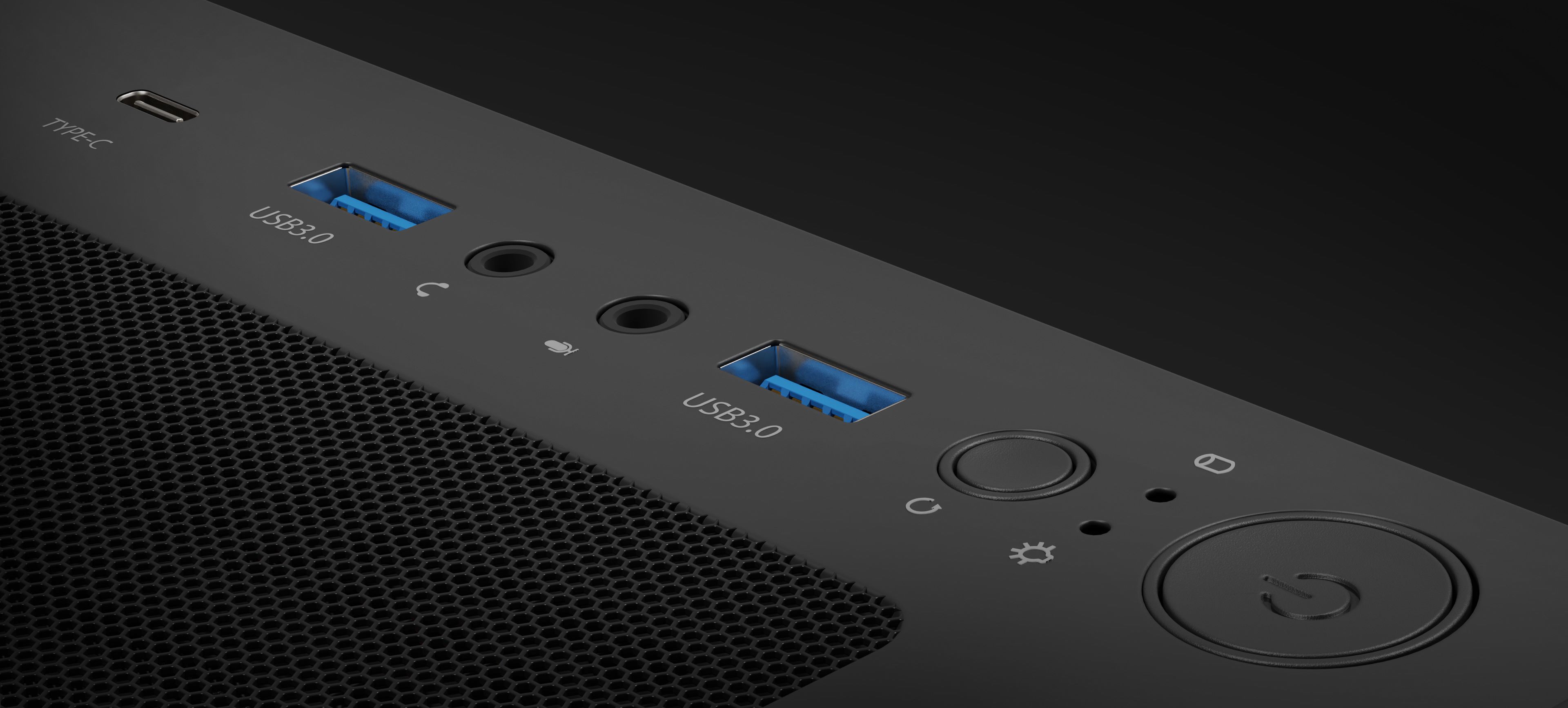 - Rozsáhlý přední panel vybavený porty USB-C (Gen 2 až 10 Gbit/s), 2× USB typu A (3.2 Gen 1) a HD audio (2× 3,5 mm).