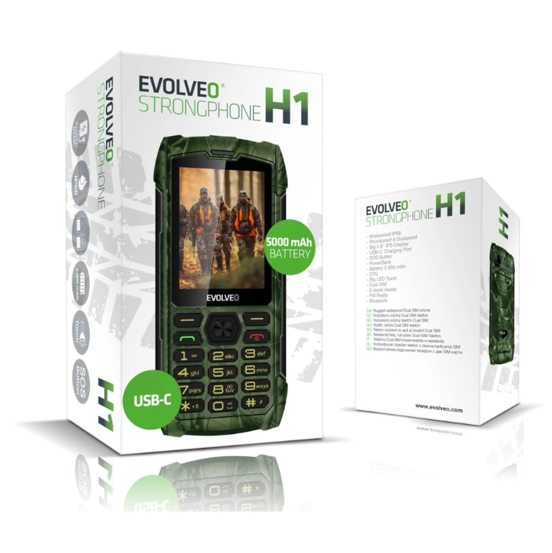 EVOLVEO StrongPhone H1 s certifikací IP68 je odolný tlačítkový telefon s funkcí dual SIM. Nevadí mu prach ani voda. Dlouhou dobu provozu zajistí baterie s kapacitou 5 000 mAh, která může převzít i funkci powerbanky. Baterie je uživatelsky vyměnitelná a je součástí základního balení. Pro zvýšení odolnosti je telefon vybaven kovovými bočnicemi. Ergonomický design a velká tlačítka zajišťují pohodlné ovládání. Telefon disponuje 2,8″ displejem a řadou praktických funkcí, jako je FM rádio, fotoaparát, čtečka elektronických knih a diktafon. V balení naleznete také hands-free sluchátka.