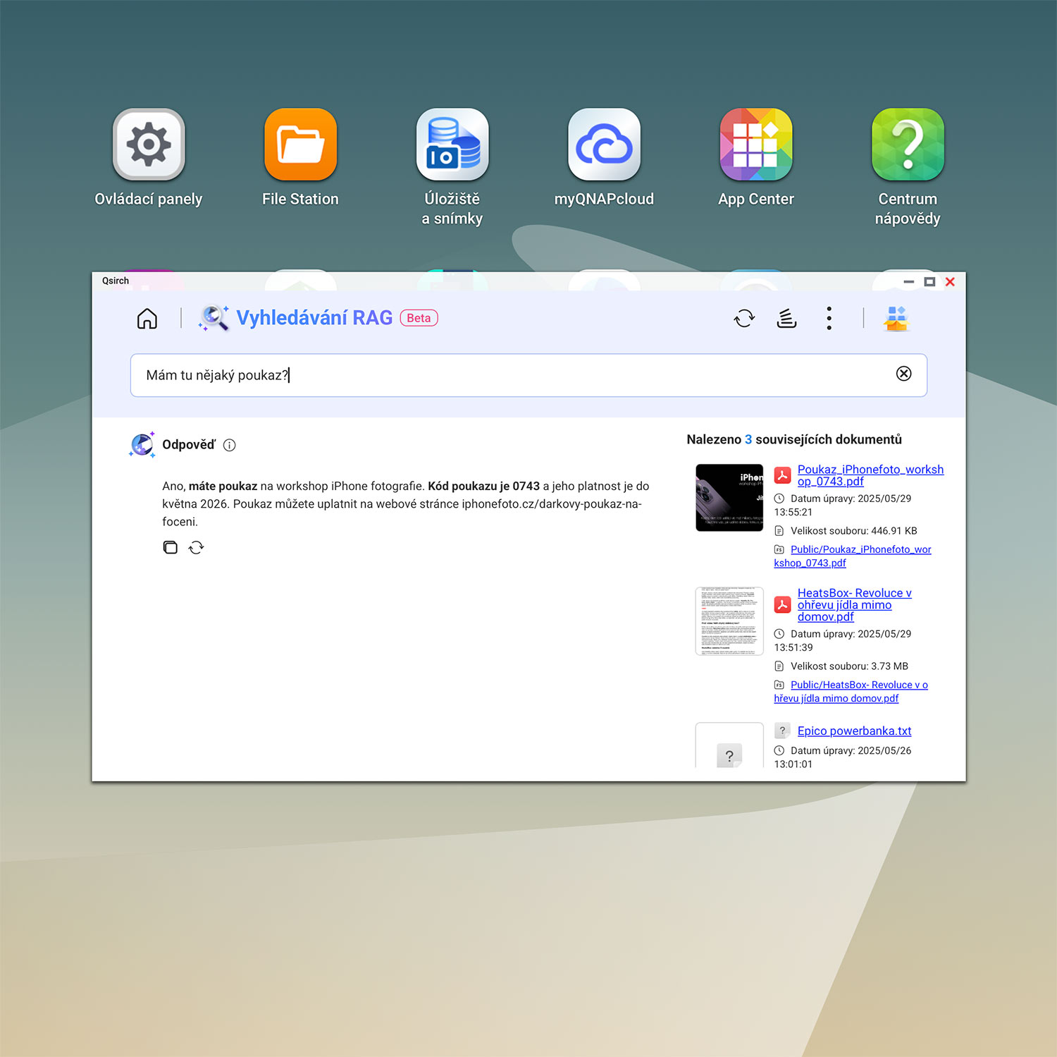 Představte si, že ve vaší firmě denně přistupujete k desítkám dokumentů, faktur, tabulek a e-mailů. Každý zaměstnanec potřebuje občas najít konkrétní informaci: kdy byla schůzka k projektu X, kdo schválil rozpočet nebo co přesně bylo v příloze e-mailu od klienta. V minulosti by to znamenalo ruční procházení složek a hledání názvů souborů nebo klíčových slov. Teď ale stačí napsat otázku, třeba: „Kdo schválil rozpočet pro projekt X a kdy?“ nebo „Kolik jsme vydělali na fakturách?“, a QNAP RAG AI Search vám během pár sekund odpoví, včetně odkazu na původní dokument. To znamená výraznou úsporu času a jistotu, že budete mít vždy relevantní odpověď.