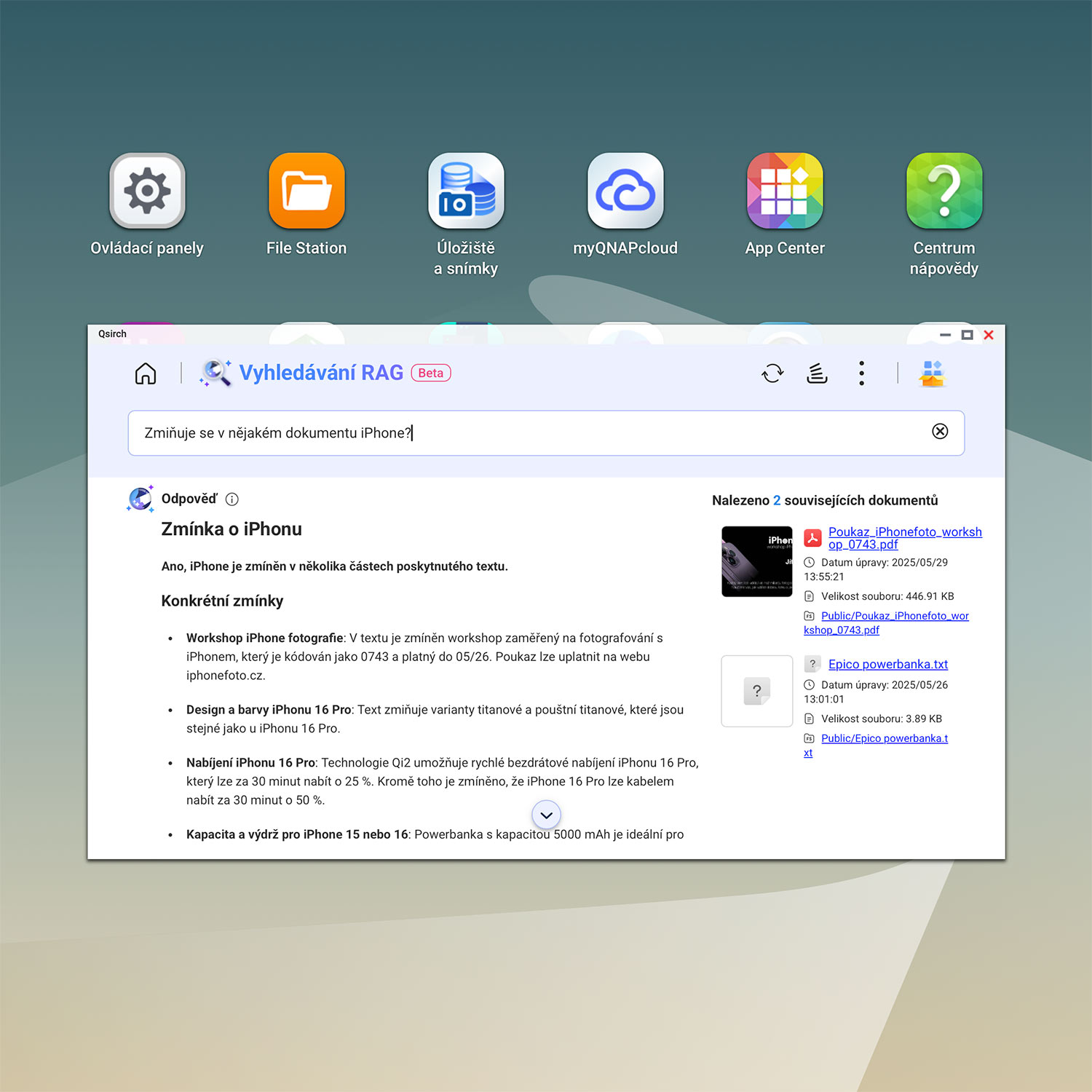 V dnešní době spravujeme čím dál více souborů, dokumentů a poznámek uložených na síťových úložištích (NAS). Avšak najít konkrétní informaci mezi stovkami nebo tisíci dokumentů bývá často únavné a zdlouhavé. Právě tady přichází na scénu QNAP RAG AI Search – řešení, které využívá moderní technologii RAG (Retrieval-Augmented Generation) a cloudové jazykové modely (LLM) přímo ve vyhledávači Qsirch. Ten nově umí zpracovat dotazy v přirozeném jazyce a poskytovat srozumitelné a rychlé odpovědi, včetně generování shrnutí a tabulek.