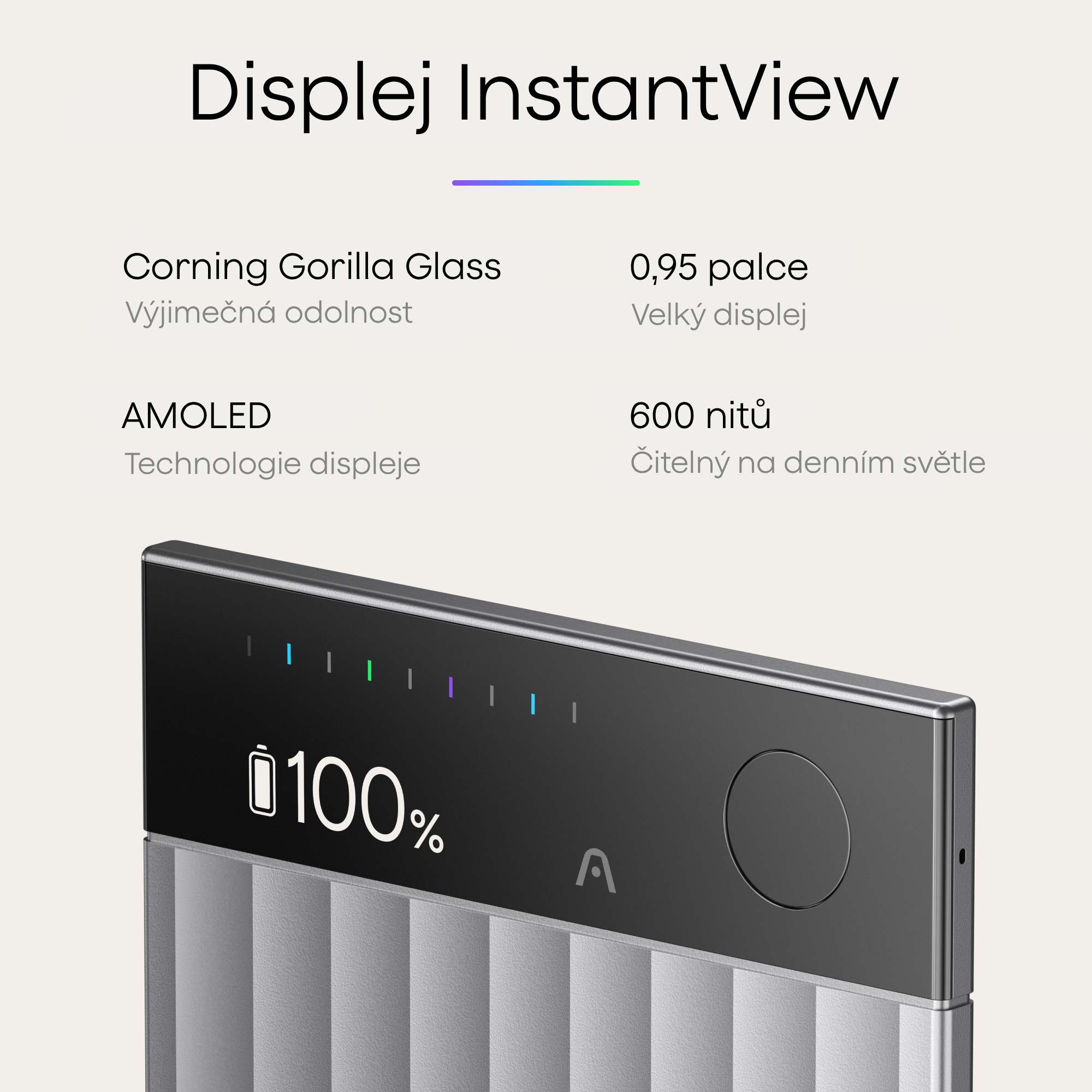 - Displej: 0,95″ AMOLED, 600 nitů, 100% NTSC, Corning Gorilla Glass.