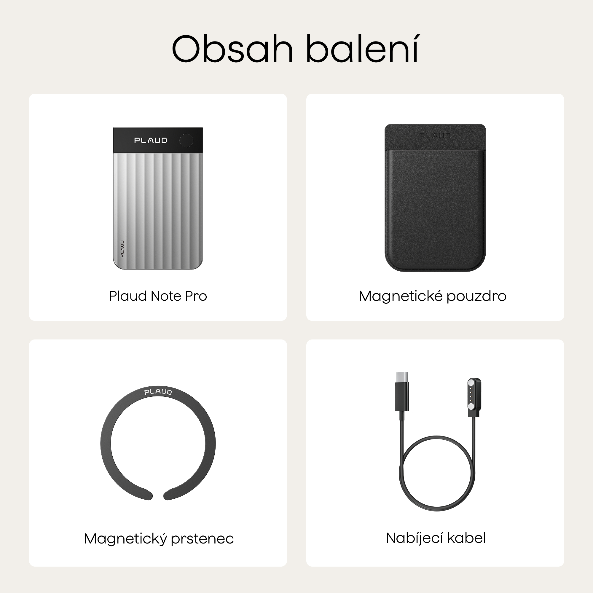 - Balení: Note Pro, MagSafe pouzdro, MagSafe adaptér pro ne‑Apple telefony, USB‑C nabíjecí kabel, příručka.