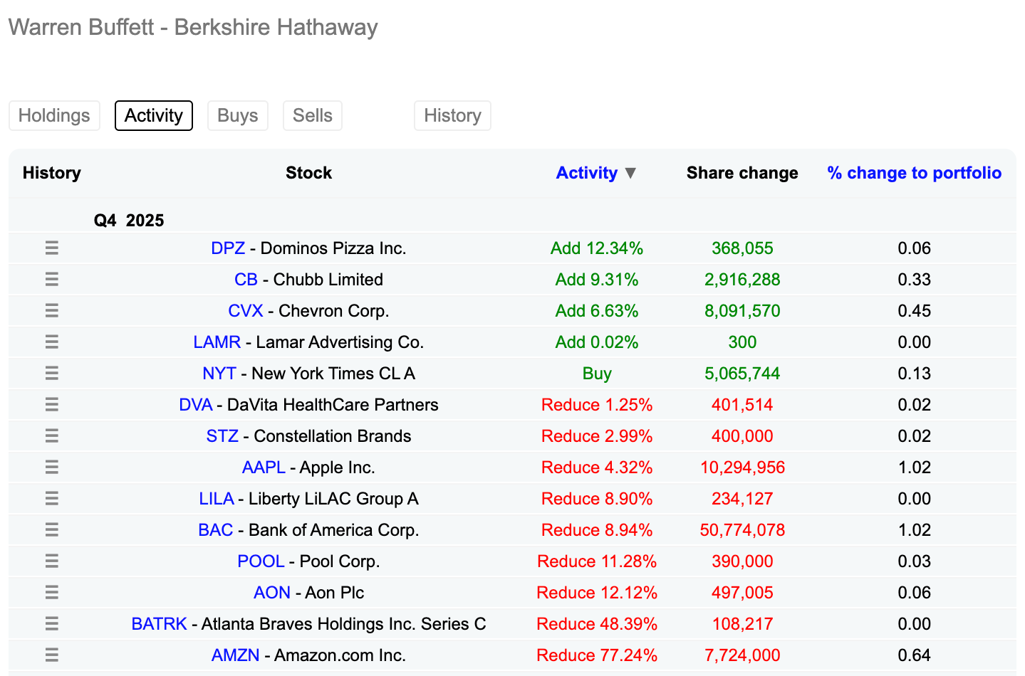 Hned na úvod je třeba říct, že Buffett zůstal věrný své pověsti klidného stratéga – žádné zběsilé nákupy se nekonaly. Jedinou úplnou novinkou v portfoliu se stala mediální skupina The New York Times, která nyní tvoří necelých 0,13 % celkového majetku firmy. Kromě toho si „lidé od Buffetta“ jen lehce přikoupili akcie ropného gigantu Chevron, pojišťovny Chubb, řetězce s pizzou Domino’s a reklamní společnosti Lamar Advertising. Ve všech případech šlo spíše o kosmetické úpravy portfolia než o sázku na nového koně. Pokud chcete podrobně vědět, jak společnost Berkshire funguje, můžete si přečíst detailní e-book.