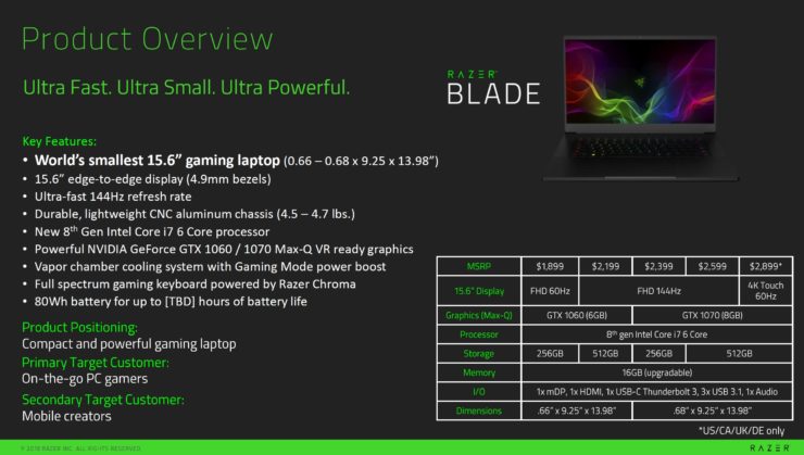- 1070 Max-Q, 8GB GDDR5, IPS matný 1920×1080 při 144 Hz, 256 GB SSD za $2,399 (52 500 Kč)