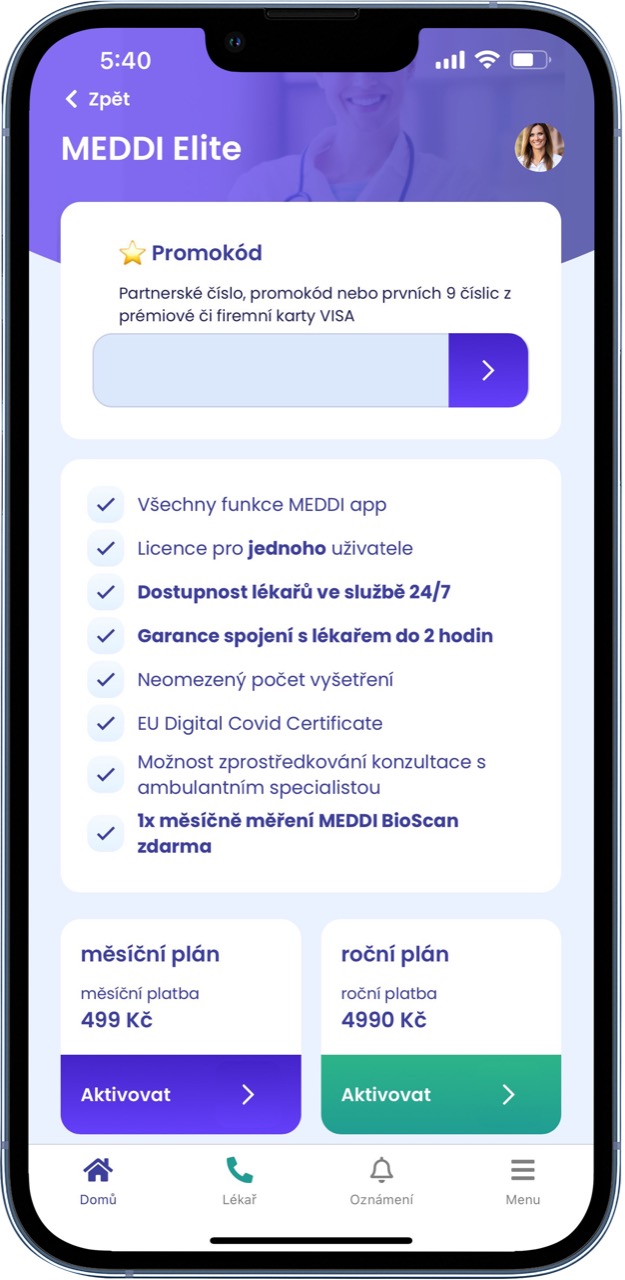 Nyní máte navíc možnost vyzkoušet si lékaře na telefonu na tři měsíce zdarma v rámci spolupráce společností CZC.cz a MEDDI hub. Stačí zakoupit jeden z výrobků v kategorii CZC.Health označený štítkem MEDDI, stáhnout aplikaci MEDDI app v Google Play nebo App Store a vložit promokód pro předplatné MEDDI Elite zdarma na tři měsíce. Služby můžete začít využívat okamžitě a v nadcházejícím období plném viróz a nachlazení tak ušetřit drahocenný čas strávený v čekárnách.