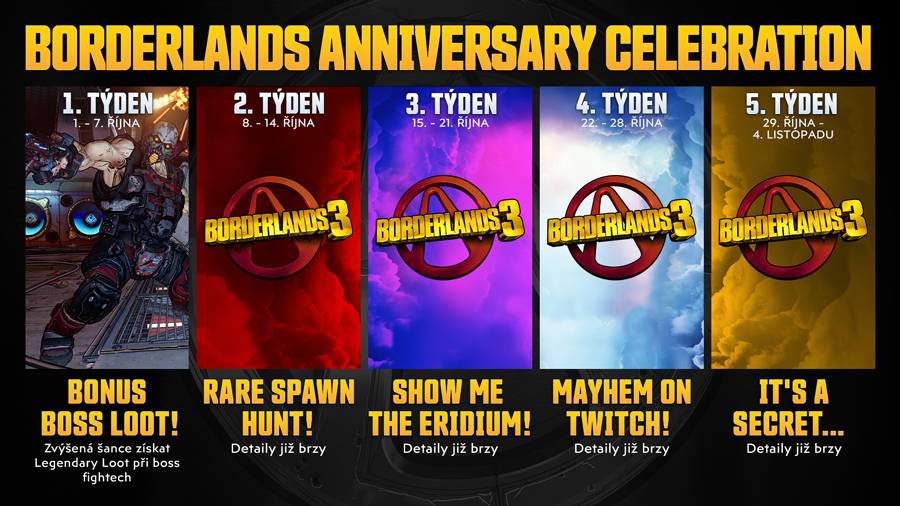 Tento měsíc tomu bude přesně 10 let, kdy vyšla první hra Borderlands, která spatřila světlo světa 20. října 2009. Na oslavu tohoto výročí si společnost 2K Games přichystala pro všechny fanoušky série 5 týdnů plných exkluzivních odměn v rámci nové hry Borderlands 3. Po celý říjen (a část listopadu) budou mít hráči všech úrovní možnost získat zajímavý herní loot a exkluzivní bonusy.