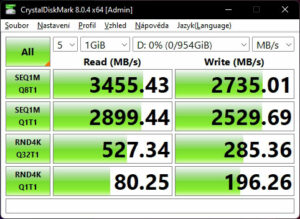 Test rychlosti v aplikaci CrystalDiskMark udávaná čísla potvrzuje – disk skutečně zvládl v sekvenčním režimu dosáhnout téměř na čistou hranici 3.500 MB/s a v zápisu dokonce vystřelil až nad 2.700 MB/s. Přesuny souborů i načítání aplikací tak budou opravdu bleskové.