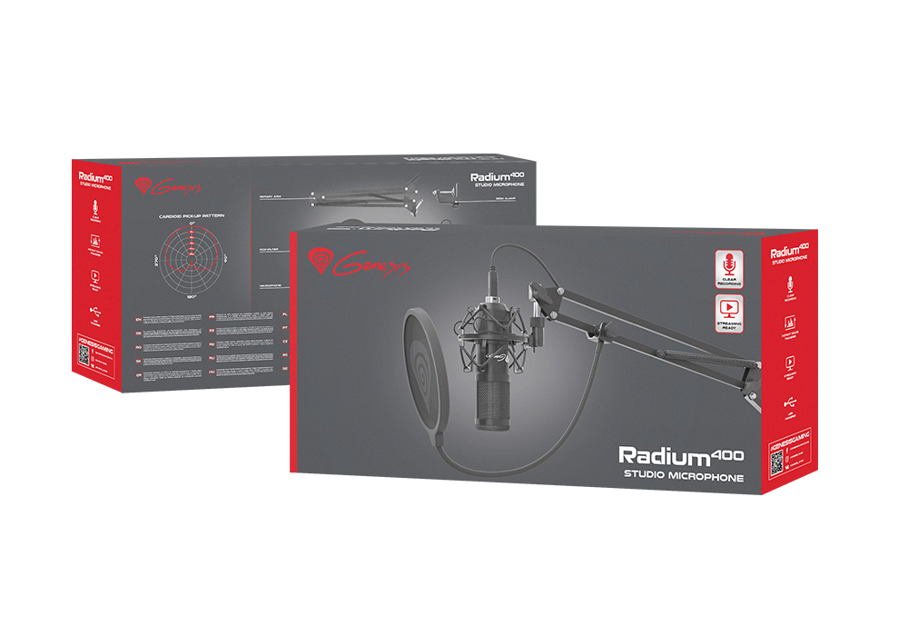 Genesis Radium 400 je kapacitní mikrofon s kardioidní polarizaci, který poskytuje skvělou reprodukci zvuku a jeho kapsule je navržena tak, aby co nejlépe sbírala hlas, který proudí odpředu směrem k ní a účinně eliminovala zvuky za mikrofonem. Tato funkce se nazývá kardioidní polarizace, díky které mikrofon realisticky reprodukuje barvu hlasu a tóny. Aby mikrofon Radium 400 poskytl maximální komfort a kvalitu užívání, balení obsahuje řadu užitečných doplňků jako jsou: pop-filtr, pěnová houbička, stolní držák s ohebným ramenem a anti-vibrační košík. Pop-filtr účinně eliminuje nepříjemný zvuk při takzvaných „výbušných souhláskách“ a pěnová houbička nejen chrání kovovou konstrukci mikrofonu, ale funguje také jako další filtr proti šumům. Ohebné rameno umožňuje nastavení mikrofonu v jakékoliv pozici, čímž zvyšuje komfort používání a kvalitu nahrávky. Pomocí těchto doplňků bude nahrávání a streamování jednodušší a profesionálnější.