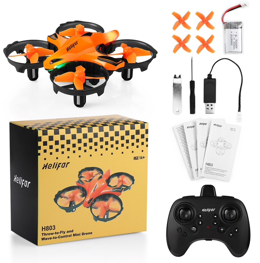 Záujemcovia tiež uvítajú možnosť „Throw and Go“, ktorá umožňuje rýchli vzlet dronu jednoduchým vyhodením do vzduchu. Dron poháňa dvojica batérií (3.7V, 300mAh), ktoré zabezpečujú let trvajúci 7 minút. Diaľkové ovládanie ponúka až 50m vzdialenosť od samotného dronu, čo vám dá dostatok voľnosti pri pohybe a rôznych kreáciách. S dronom Helifar H803 Mini môžete kľudne lietať aj v noci alebo za podmienok s horšou viditeľnosťou, keďže disponuje LED osvetlením, vďaka ktorému ho budete mať stále na očiach. V prípade oboch produktov však výrobca neodporúča lietanie v intenzívnom daždi alebo počas silnom vetre.