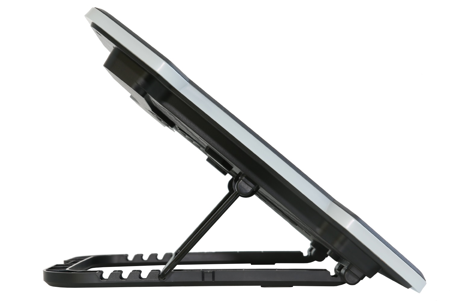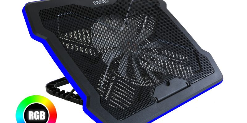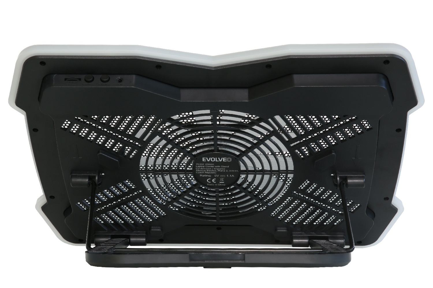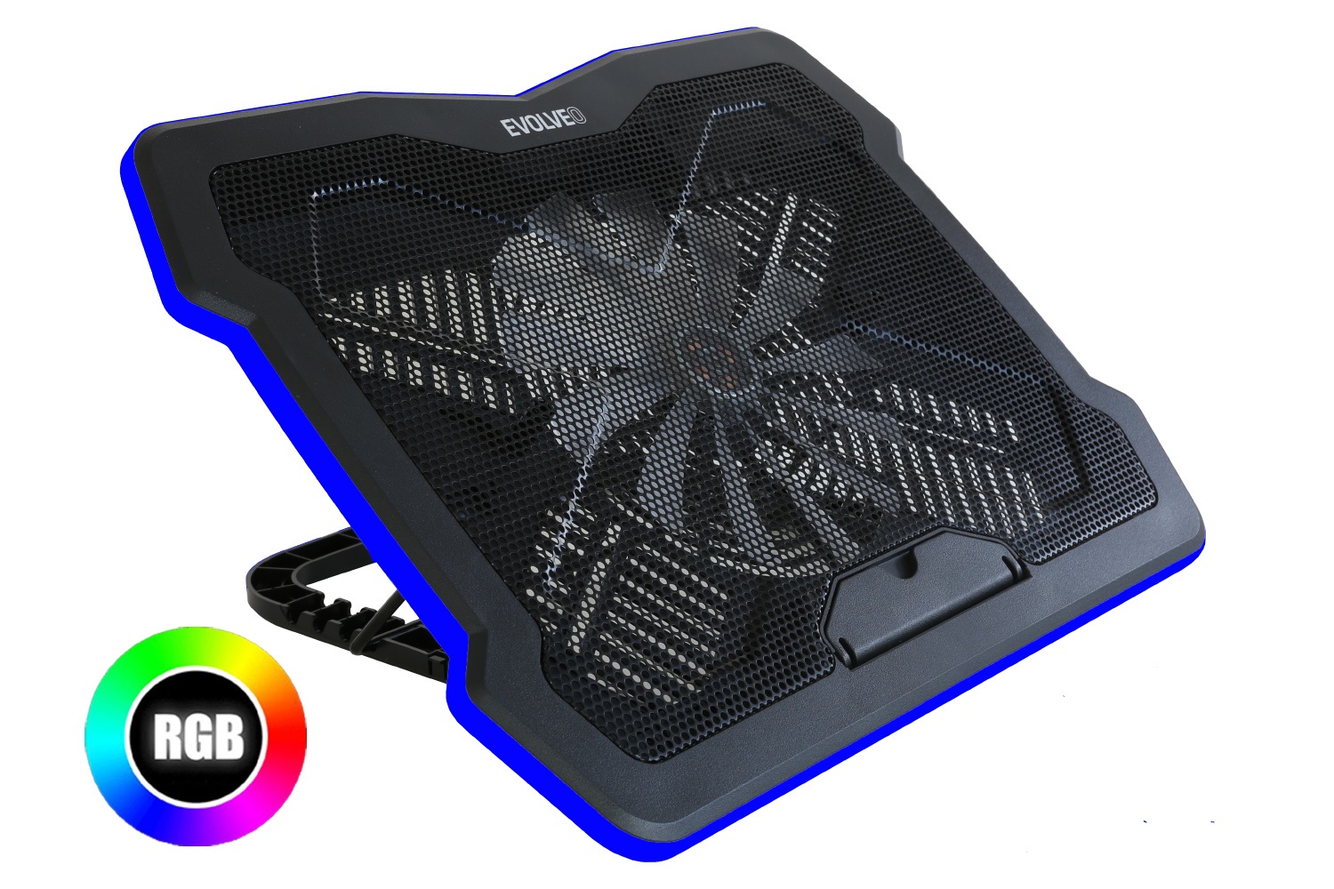 Chladicí podstavec pod notebooky EVOLVEO Ania 6 RGB je vhodný pro všechny notebooky až do velikosti 17″ a má efektní RGB podsvícení s možnostmi nastavení barevných kombinací a režimů. Podstavec je polohovatelný v pěti úhlech, a umožňuje tak individuální nastavení polohy podle přání uživatele. Rychlost otáček jediného, rozměrného ventilátoru, je možné regulovat, případně zcela vypnout. Solidní provedení a použité materiály garantují vysokou kvalitu a odolnost podstavce. Použitá kovová mřížka účinně zajišťuje průchod vzduchu a chlazení notebooku.