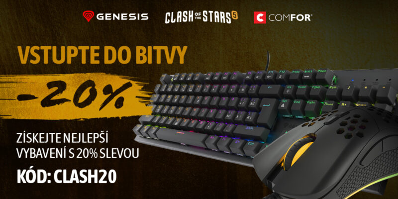 Galavečer série Clash of the Stars 5 proběhne v Praze 10. 6. 2023 a značka Genesis bude u toho. Navíc pro všechny počítačové nadšence a hráče nabízí 20% slevu na své produkty mezi které patří herní počítačové myši, mechanické klávesnice, headsety i herní křesla. Sleva je dostupná po zadání kódu CLASH20 při nákupu produktů Genesis na webu comfor.cz do 30. června 2023.