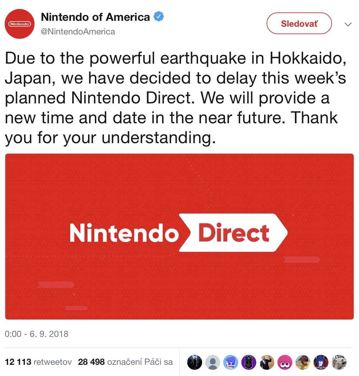Dnes sa mala konať 35-minútová konferencia Nintendo Direct, na ktorej mala spoločnosť prezentovať svoje plány ohľadom hier na konzoly 3DS a Switch. Nedávny sled udalostí však zapríčinil presunutie konferencie na iný dátum. Môže za to veľmi silné zemetrasenie v japonskom Hokkaido, ktoré spôsobilo veľký počet škôd.